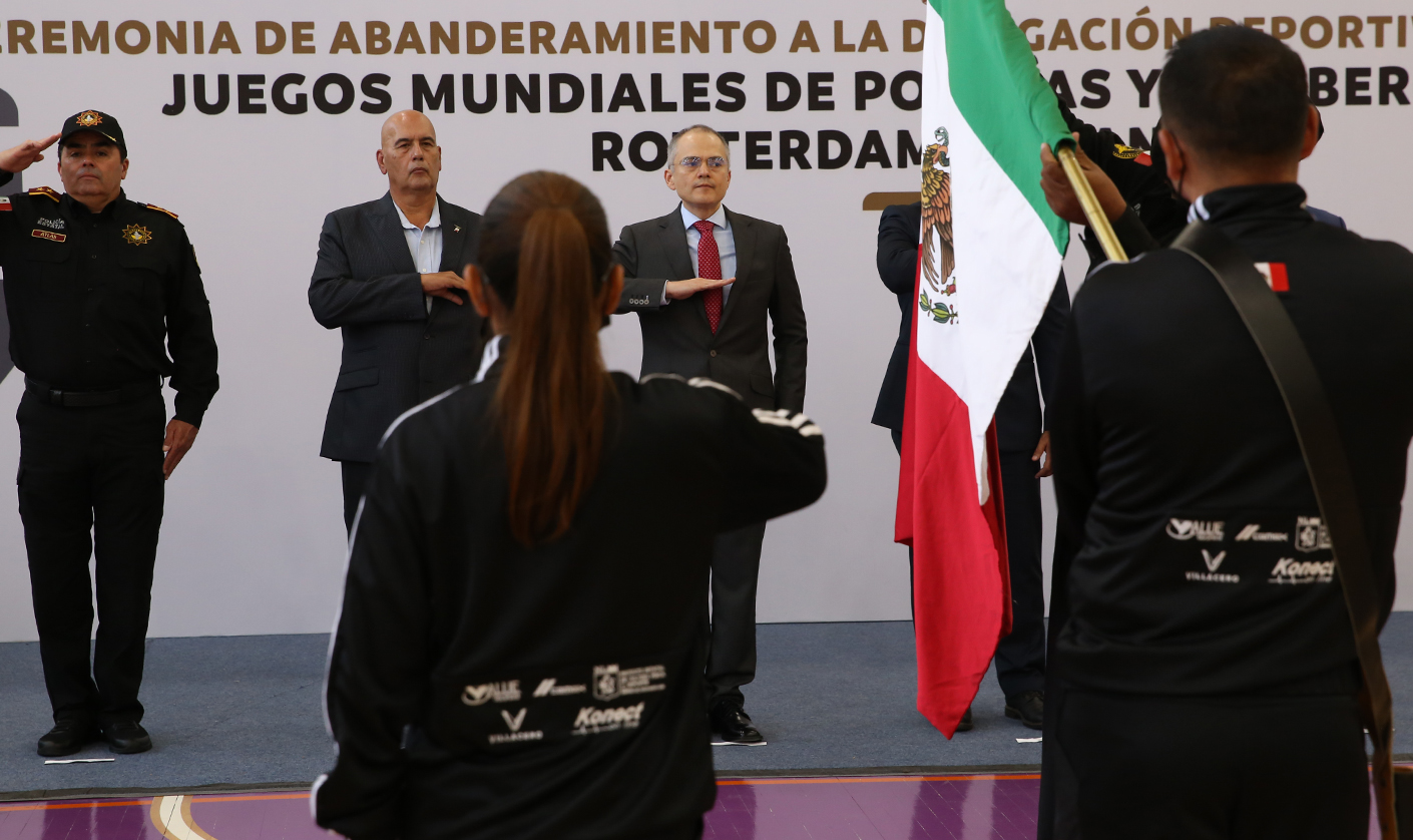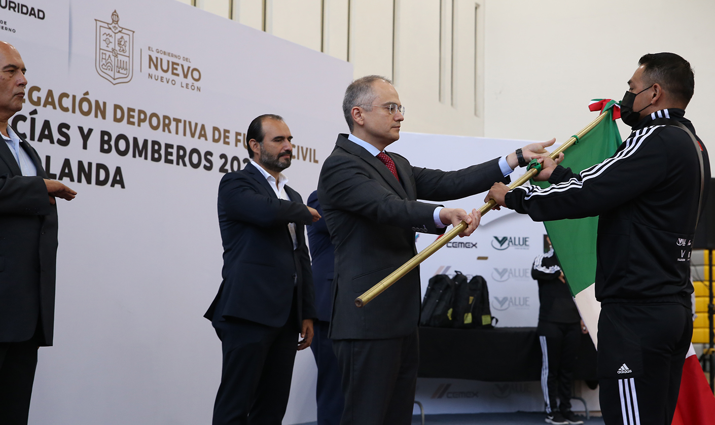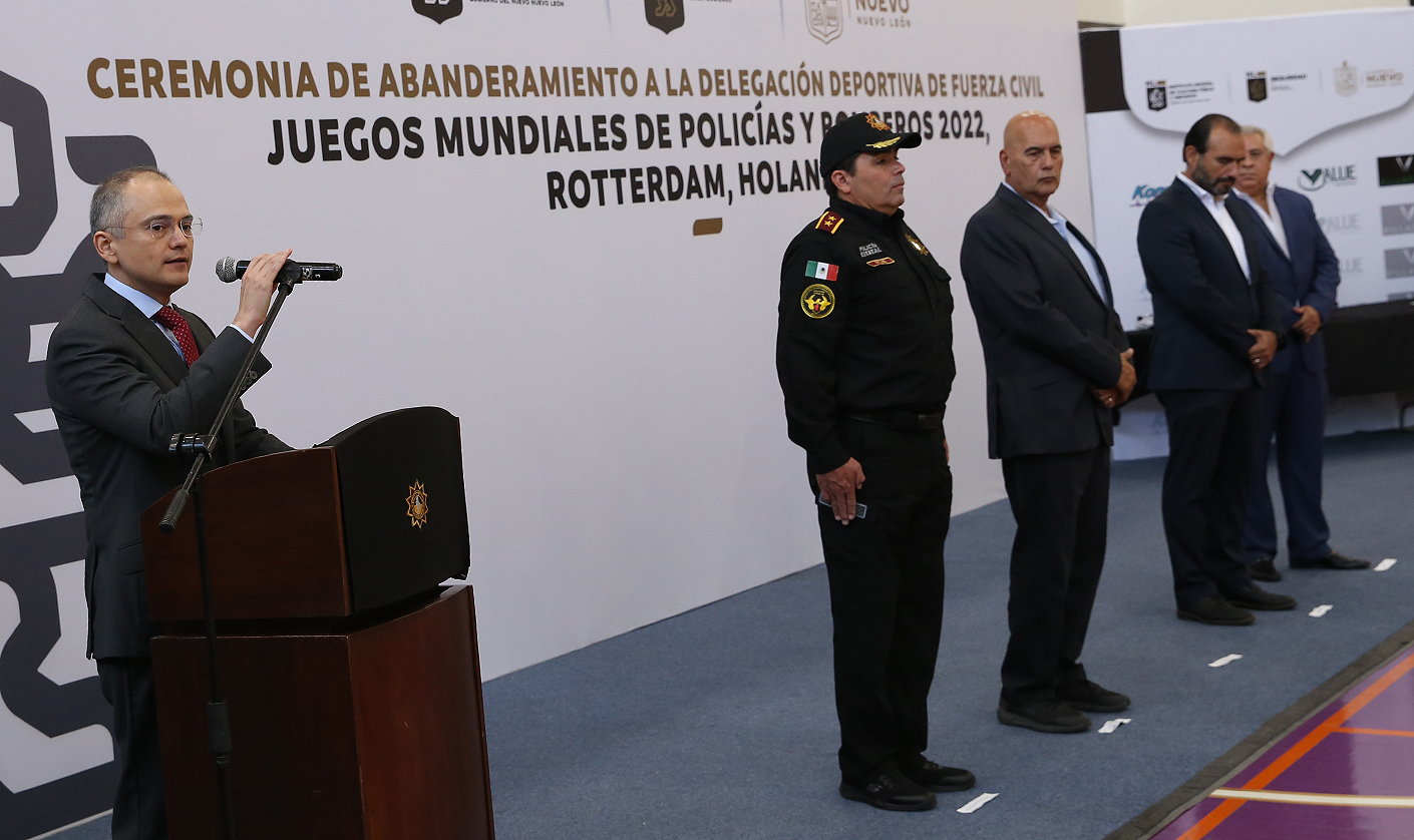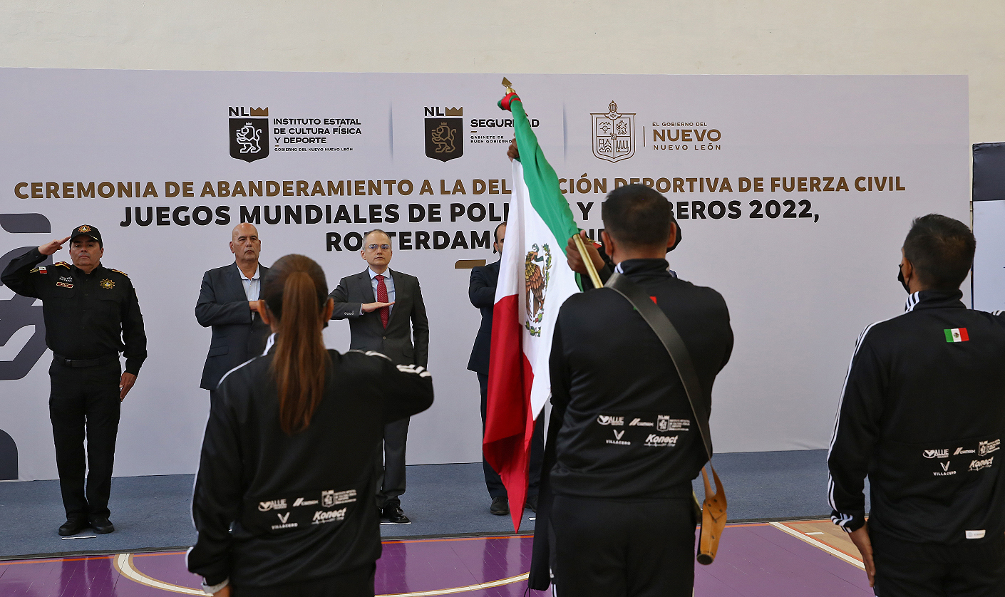 En una ceremonia encabezada por Gerardo Saúl Palacios Pámanes, Secretario de Seguridad Pública del Estado de Nuevo León, se llevó a cabo el abanderamiento a elementos de Fuerza Civil que representarán al estado en los Juegos Mundiales de Policías y Bomberos 2022 en Rotterdam, Holanda.