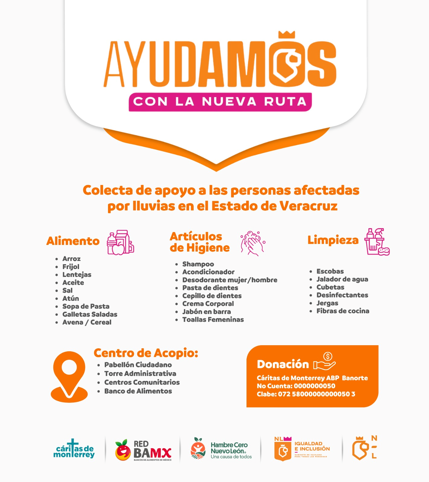- Habilita Secretaría de Igualdad e Inclusión centros de acopio en Nuevo León en Centros Comunitarios, Torre Administrativa, Pabellón Ciudadano y Banco de Alimentos de Cáritas de Monterrey para recibir ayuda alimentaria y enseres de higiene personal destinados a las personas afectadas por las lluvias en Veracruz.