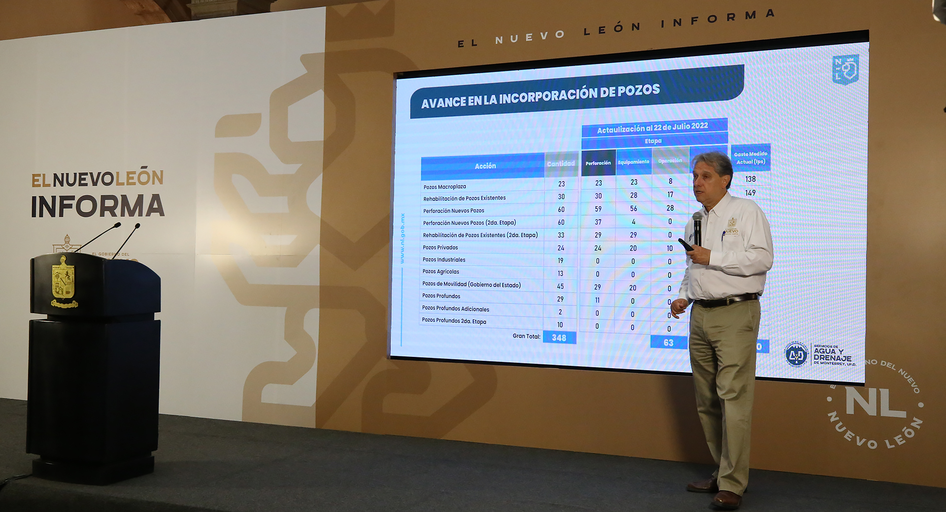 En la rueda de prensa Nuevo León Informa, el Director General de AyD, Juan Ignacio Barragán señaló que siguen perforando nuevos pozos, rehabilitando pozos que ya existían pero que no estaban en funcionamiento, pozos privados, pozos industriales, pozos agrícolas, pozos que clausuró la Secretaría de Movilidad y, recientemente la paraestatal comenzó trabajos de perforación en nuevos pozos profundos.