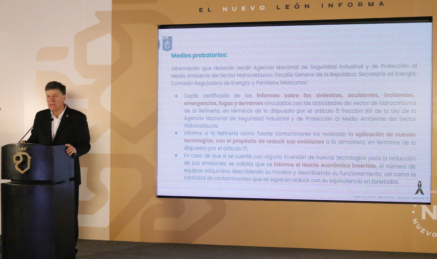 Acompañado por Armandina Valdez Cavazos, directora de la Agencia de la Calidad del Aire en el foro El Nuevo León Informa, Alfonso Martínez Muñoz, Secretario de Medio Ambiente estatal, detalló que estas evidencias formarán parte de la audiencia incidental programada para mañana 14 de febrero ante la Jueza Tercera de Distrito en Materia Administrativa en la que se busca demostrar que es la Refinería de Cadereyta la principal fuente de contaminación en el Estado.