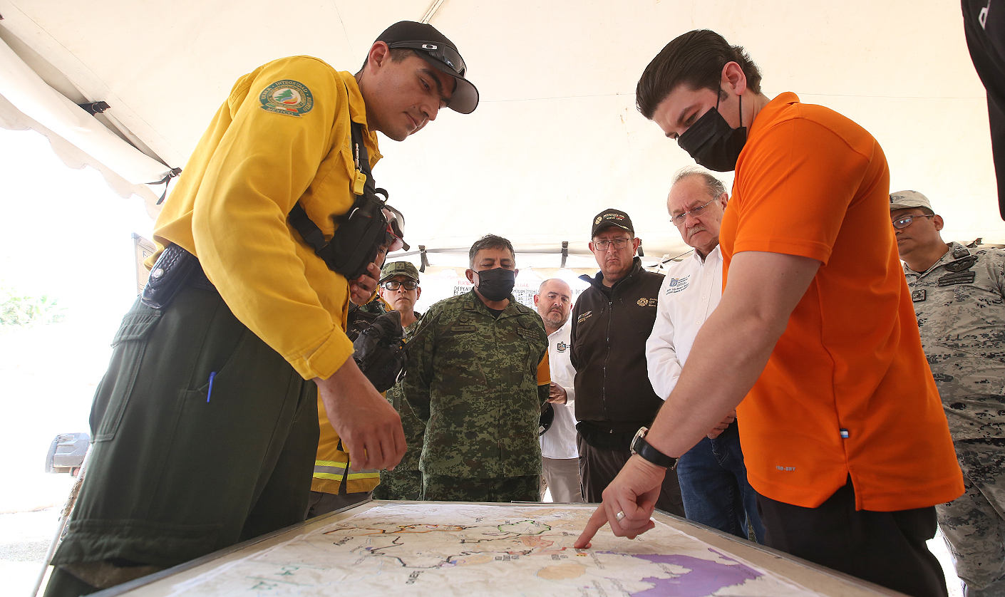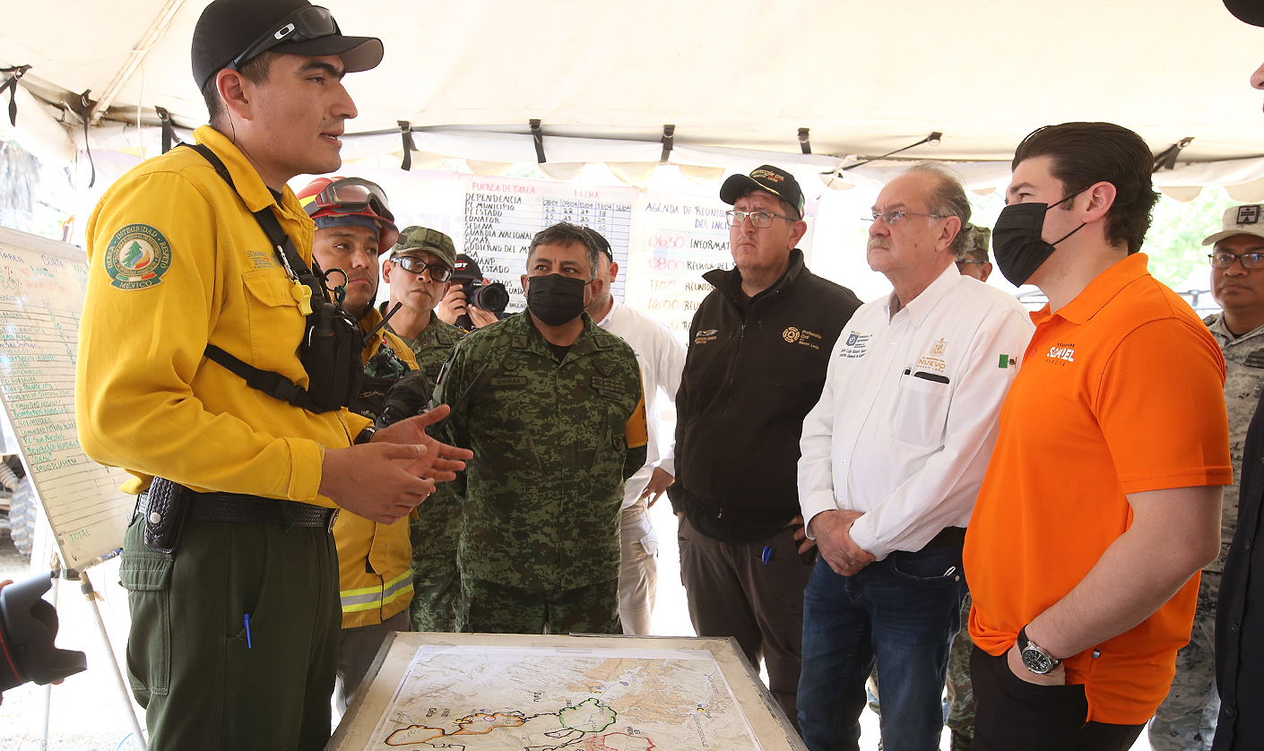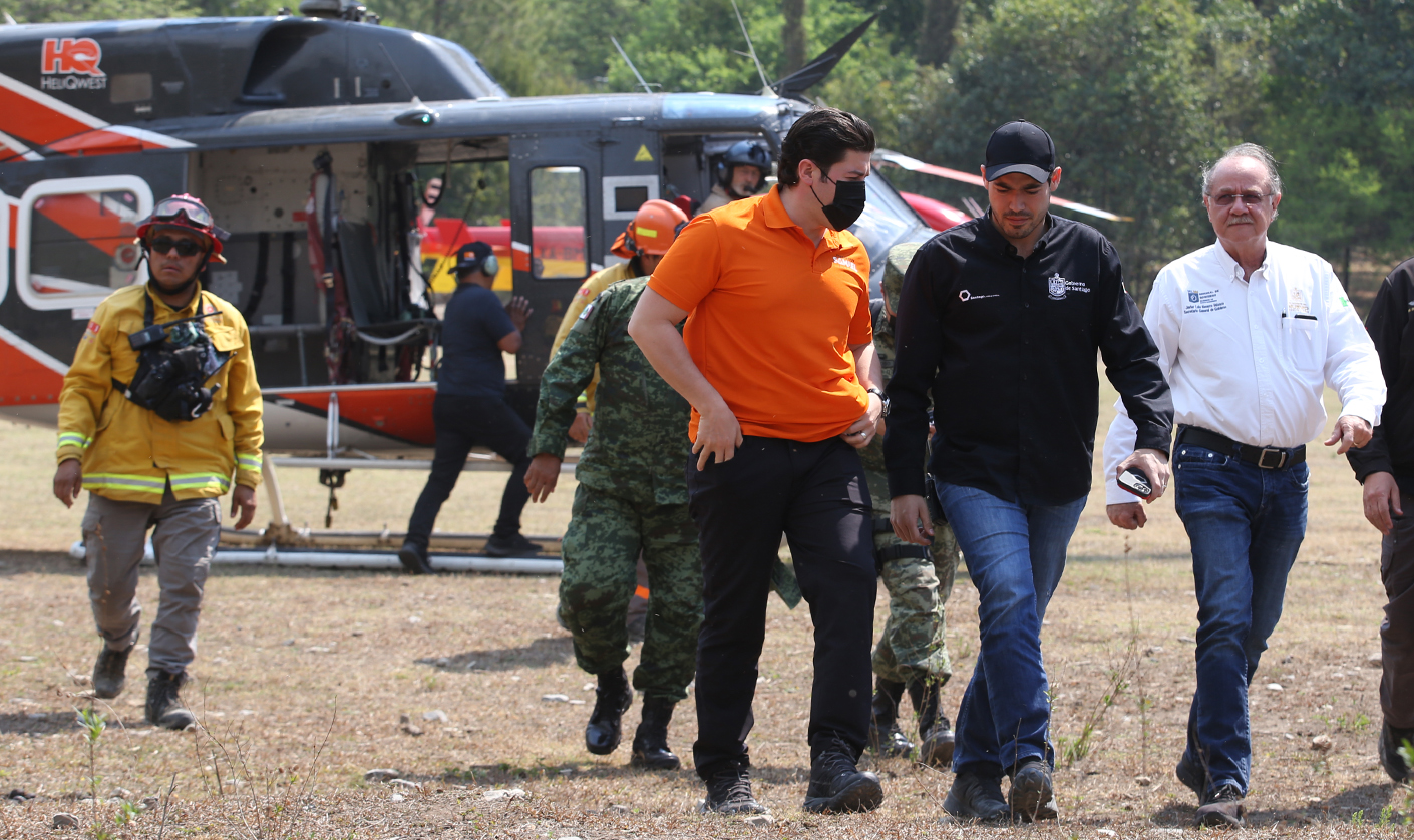 "Tenemos siete helicópteros trabajando, ahorita llegan otros dos, vamos ahorita de regreso a Monterrey a dar instrucciones a municipios, Protección Civil y bomberos, que aquí hay suficiente calle para que se acerquen, afortunadamente no hay ninguna vivienda en riesgo y vamos hoy a trabajar en conjunto con el ejército", agregó.