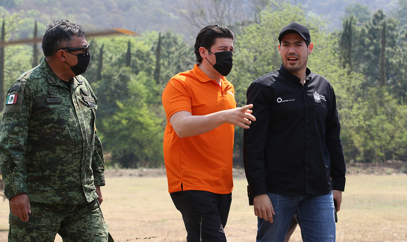 Acompañado del Secretario General de Gobierno, Javier Navarro; del Director de Protección Civil de Nuevo León, Erik Cavazos; y del alcalde de Santiago, David de la Peña, el Mandatario estatal recorrió en helicóptero las comunidades de Puerto Genovevo y Covadonga, que están siendo afectadas por las llamas.