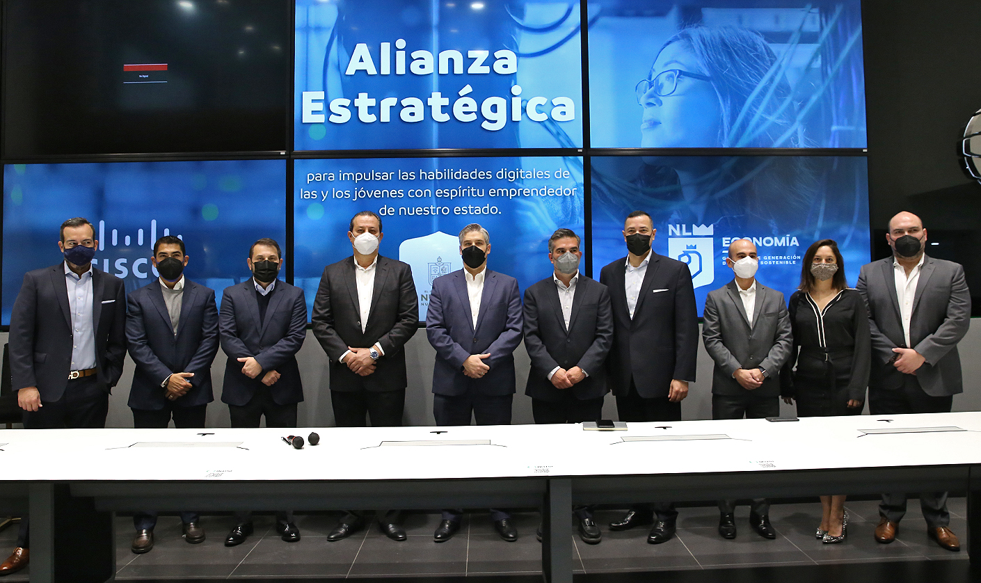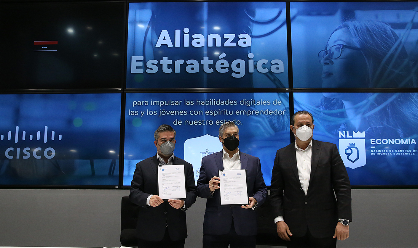 En el marco de la nueva política pública de impulso a la transformación digital y el fomento a la innovación, el Gobierno de Nuevo León y la empresa Cisco firmaron hoy una alianza estratégica que apoyará a los jóvenes emprendedores.
