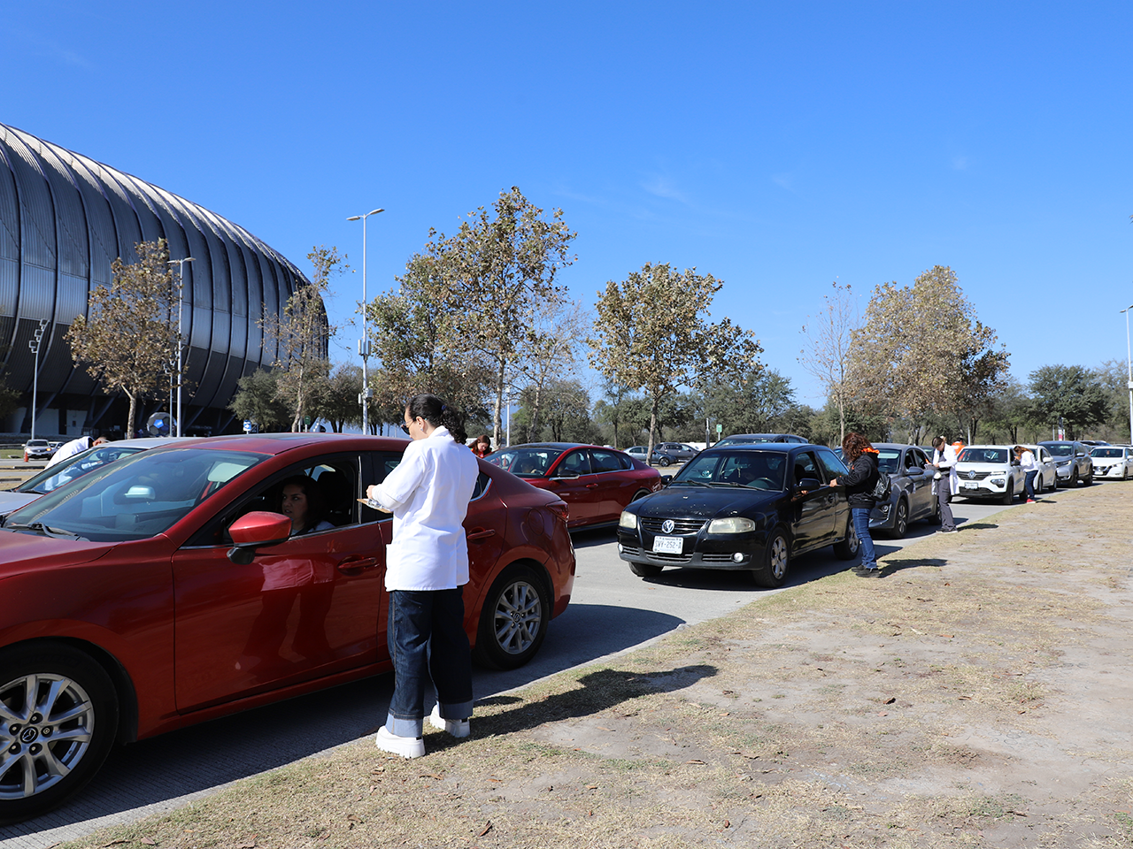 Acuden miles de personas al drive-thru instalado en el estadio de Rayados este sábado y domingo.