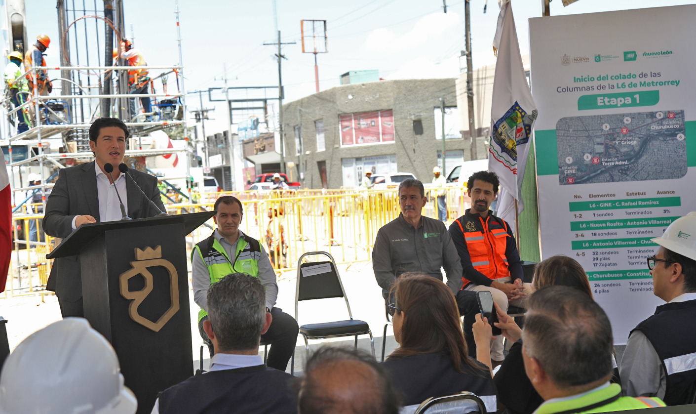 Monterrey, Nuevo León.- Tras concluir los trabajos de sondeos y cimentación en su primera etapa, el Gobernador Samuel Alejandro García Sepúlveda supervisó el inicio del colado de las columnas de la Línea 6 del Metro, la cual tendrá una longitud de 18.8 kilómetros; contará con 14 estaciones y conectará a los municipios de Guadalupe, San Nicolás y Apodaca.
