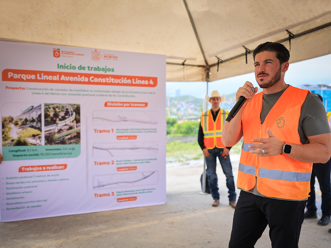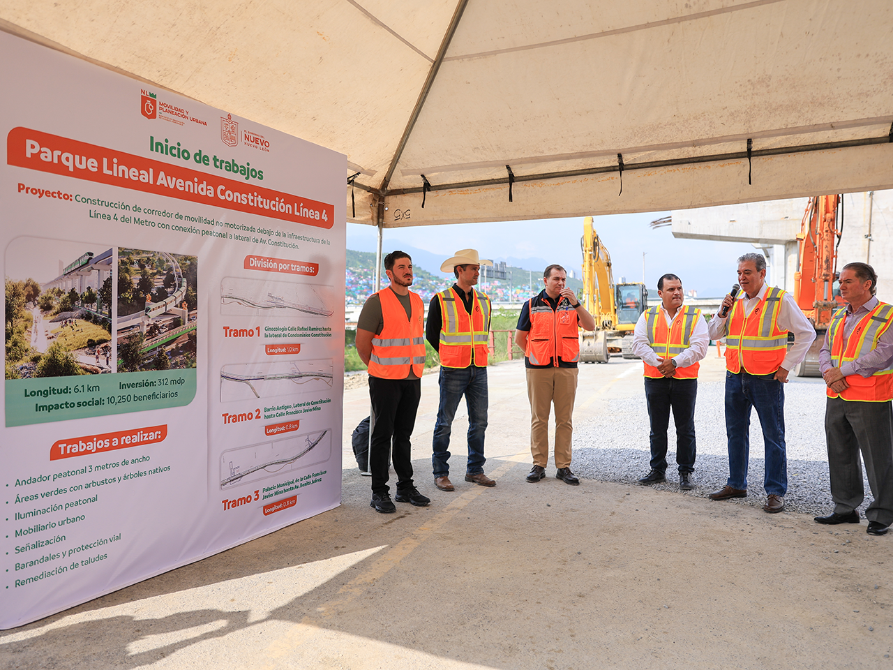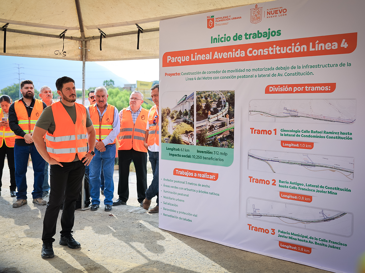 Monterrey, Nuevo León.- Con el fin de seguir creando espacios con accesibilidad universal y corredores verdes que den una imagen amigable a la ciudad, el Gobernador de Nuevo León dio arranque a los trabajos del Parque Lineal Avenida Constitución, que se realizará debajo de la línea 4 del Metro.