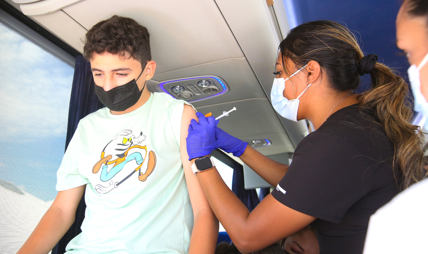 En presencia del Mandatario estatal y de Juan Carlos Mendoza, Cónsul General de México en Laredo, Texas; Alma Rosa Marroquín, Secretaria de Salud; y de Marco González, Secretario de Desarrollo Regional y Agropecuario, enfermeras de Estados Unidos ascendieron al autobús para comenzar el proceso de vacunación de mil menores de 3 a 4 años de edad.