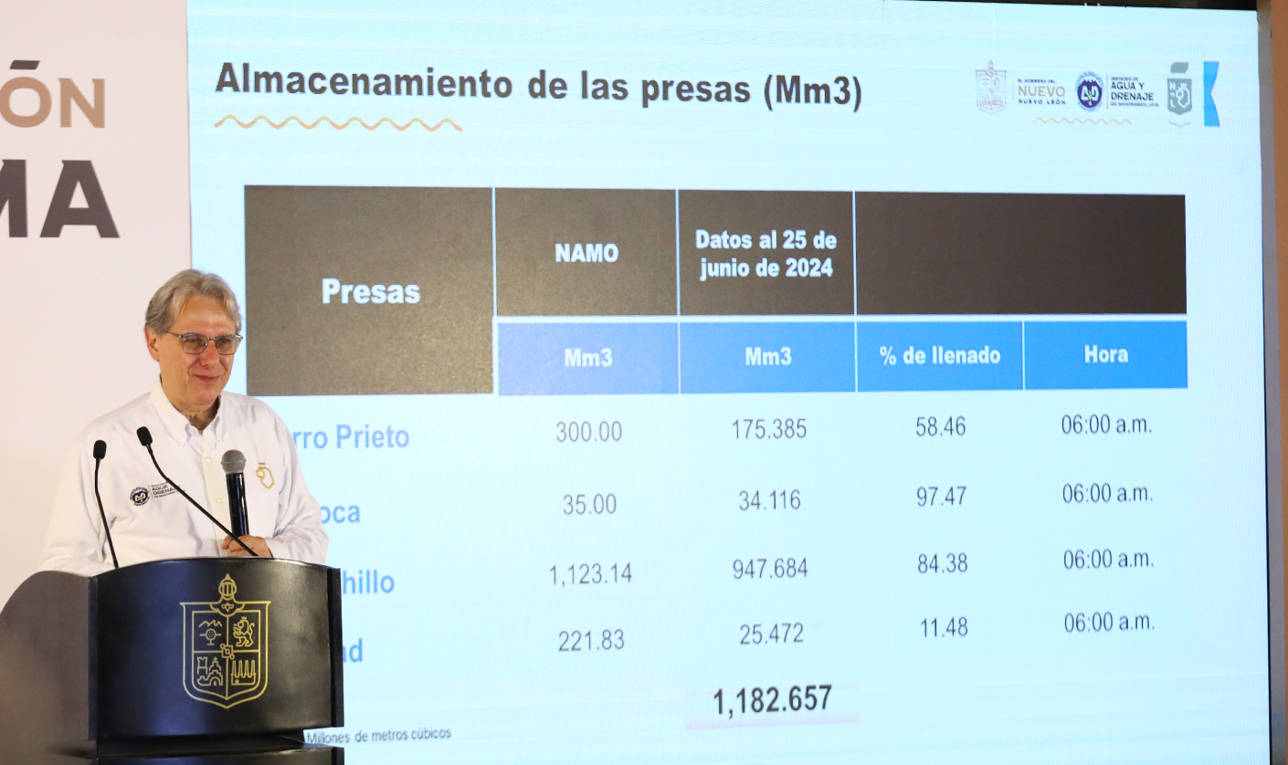 En cuanto al nivel de las presas, el director de Agua y Drenaje dijo que la presa de La Boca se mantiene en el 97 por ciento de llenado; El Cuchillo al 85 por ciento; Cerro Prieto al 58 Por ciento; y Libertad al 12 por ciento.