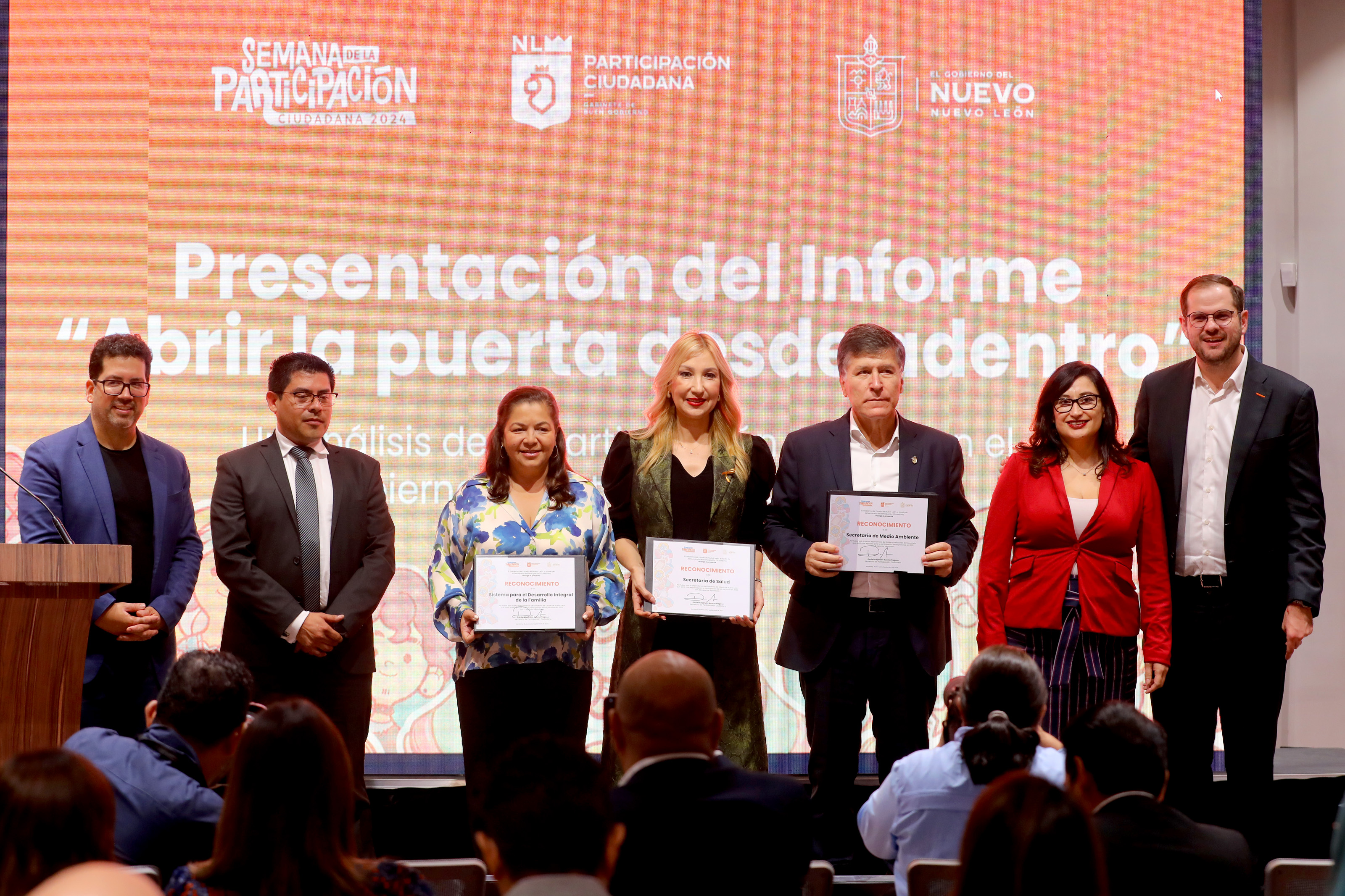 El Secretario de Participación Ciudadana entregó un reconocimiento al Secretario de Medio Ambiente, Alfonso Martínez Muñoz, por la apertura de once nuevos espacios de participación ciudadana; a la Directora del DIF Nuevo León, Gloria Ivette Bazán Villarreal por 17 nuevos espacios y la titular de Salud en el estado, Alma Rosa Marroquín Escamilla con 32 espacios reportados.