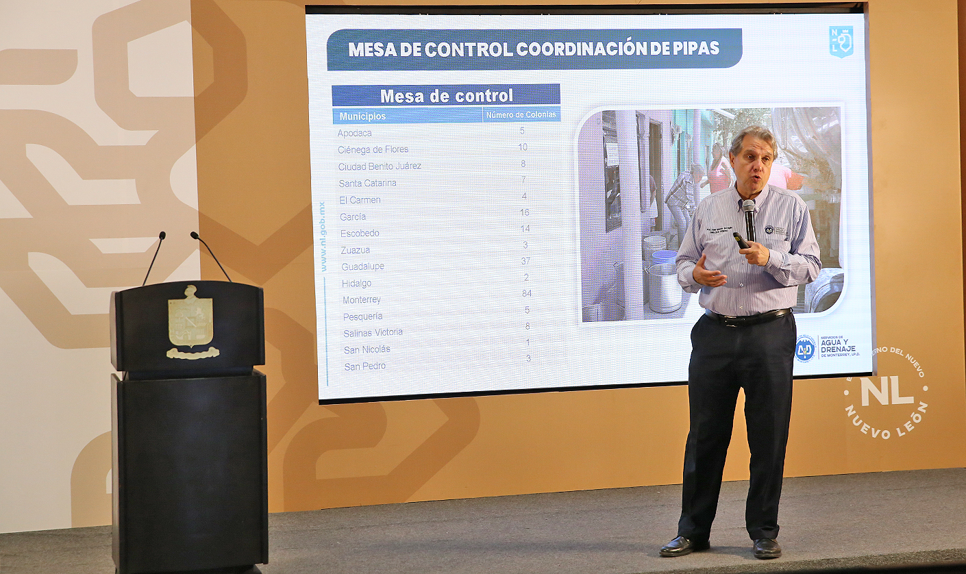 Barragán Villarreal informó que la Mesa de Control y Monitoreo está enviando agua en pipas a las colonias afectadas en el sur de la ciudad y se trabaja en coordinación con la Secretaría de Igualdad e Inclusión de Nuevo León para ubicar e instalar tanques cisterna en parques de los sectores que carecen del vital líquido.