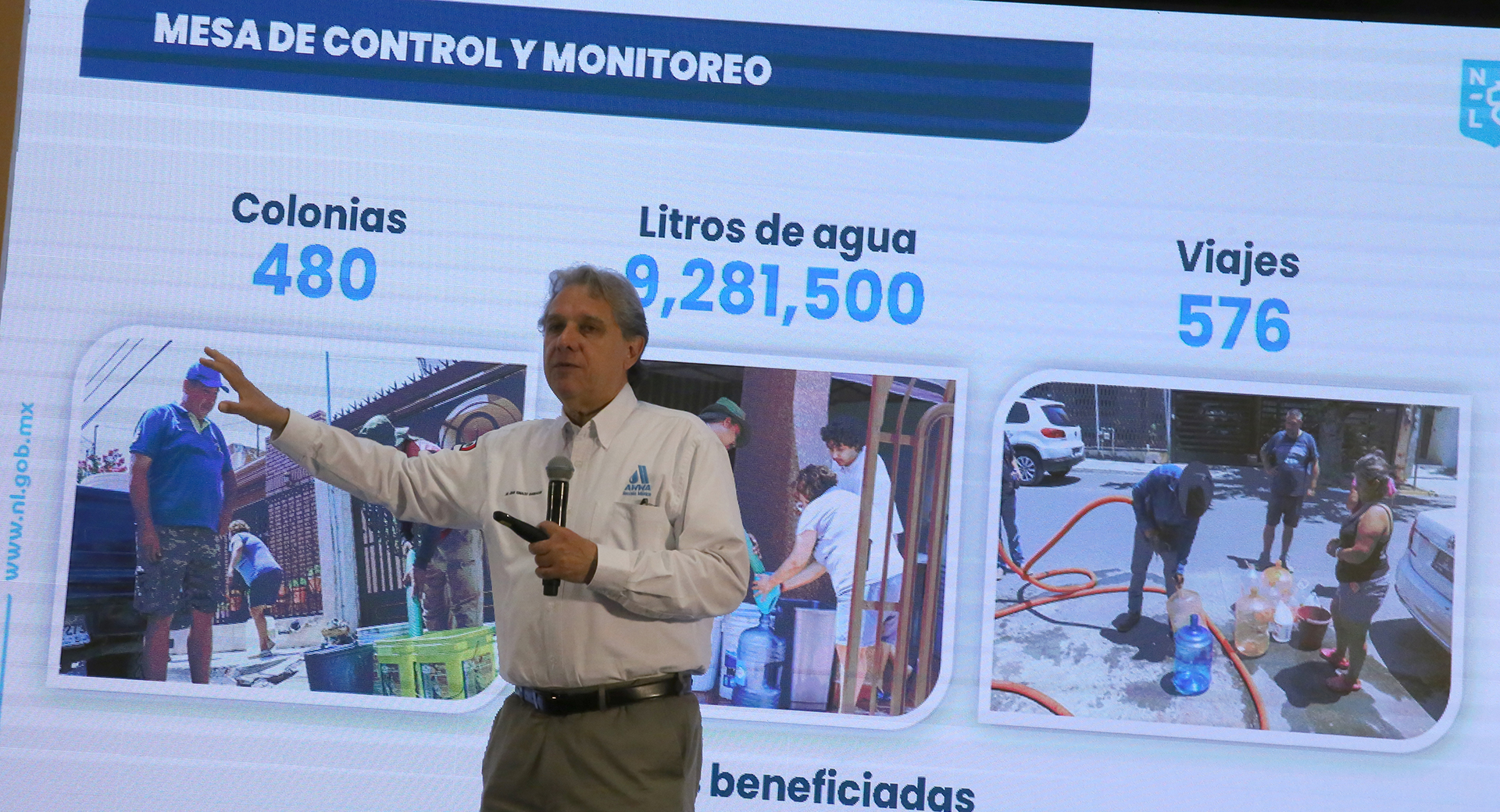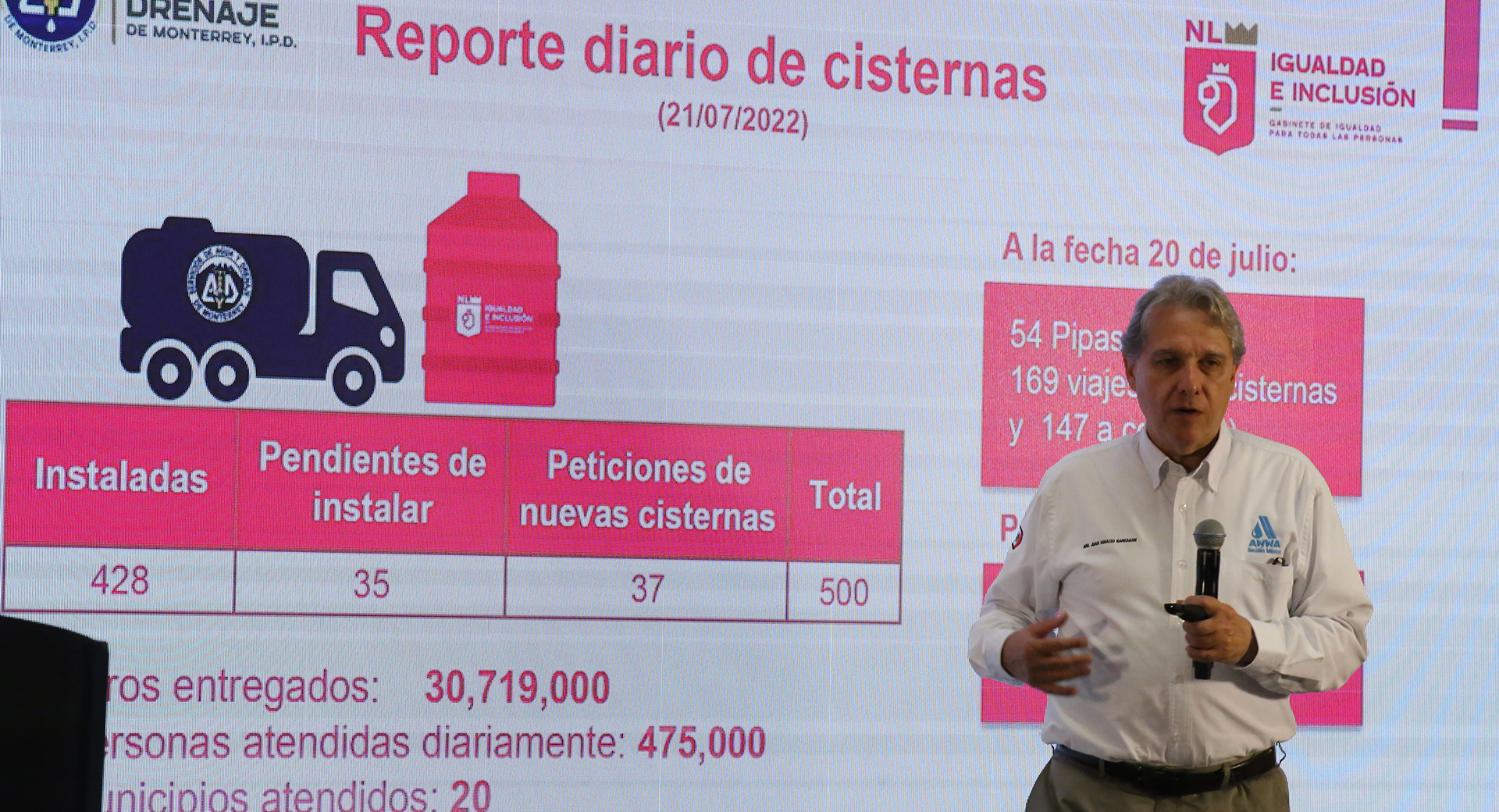 Juan Ignacio Barragán Villarreal dio a conocer que hasta el día de hoy se han instalado 428 tanques cisterna en distintos sectores de la ciudad. Asimismo, resaltó que este miércoles 20 de julio se registró la cantidad más alta de agua repartida en pipas con 9 millones 281 mil 500 litros, a 480 colonias de 16 municipios metropolitanos y de la periferia. Esto benefició a poco más de 309 mil personas.