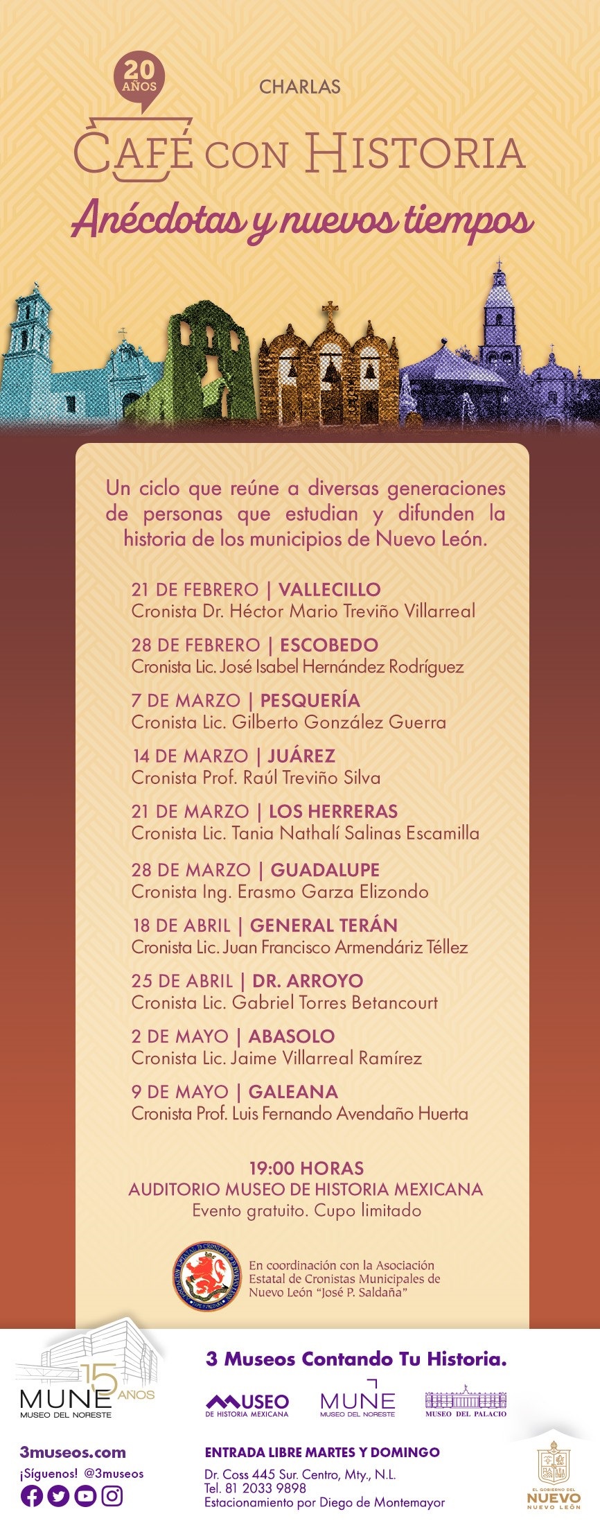 Café con Historia es un programa del Museo de Historia Mexicana en coordinación con la Asociación Estatal de Cronistas Municipales de Nuevo León “José P. Saldaña”, para este nuevo ciclo participan los municipios de Vallecillo, Escobedo, Pesquería, Juárez, Los Herreras, Guadalupe, General Terán, Dr. Arroyo, Abasolo y Galeana.