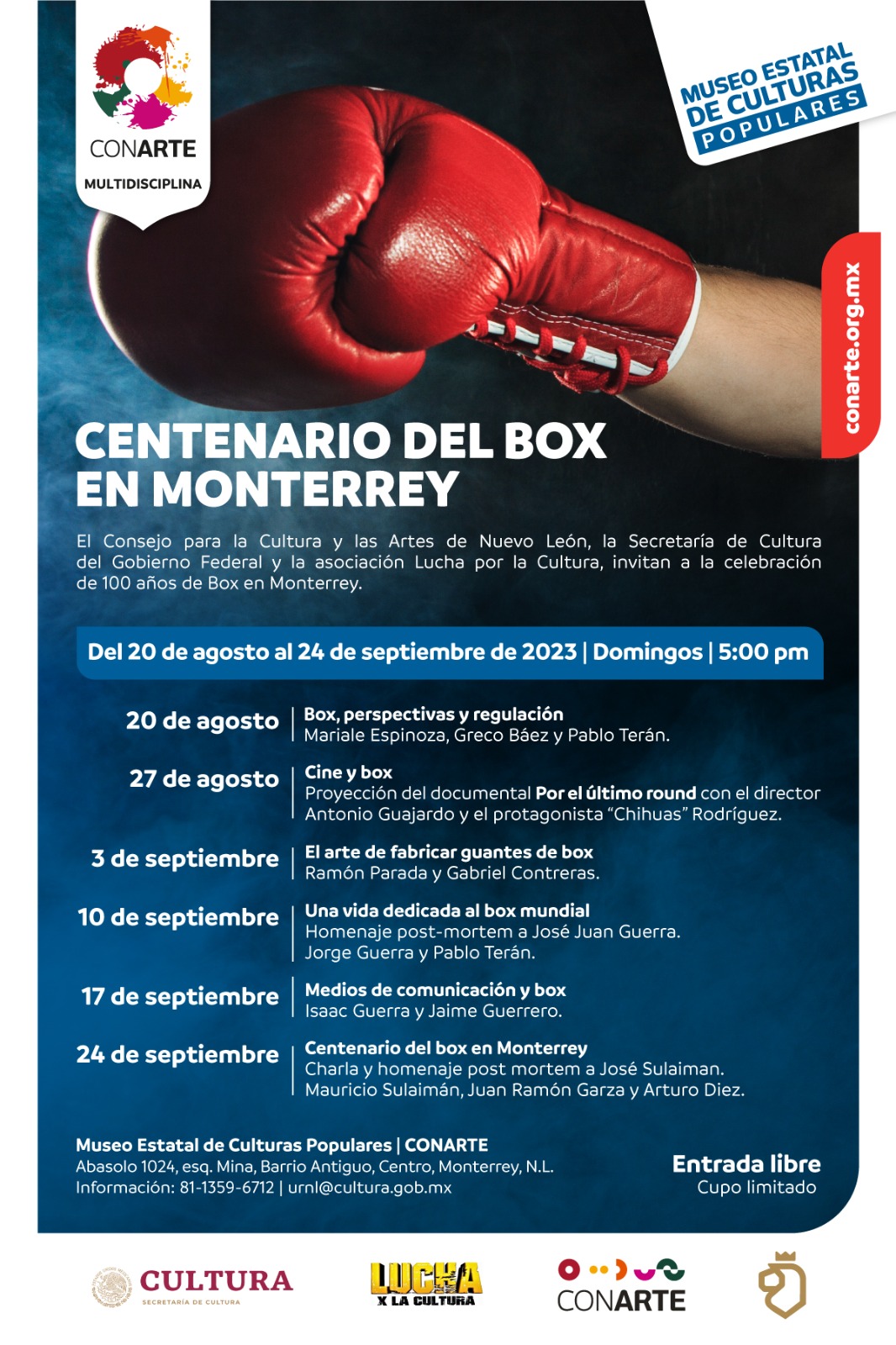 Monterrey, Nuevo León. - Con homenajes a José Sulaimán y Juan José Guerra, el Consejo para la Cultura y las Artes de Nuevo León | CONARTE, celebra los 100 años del box en Monterrey a partir del domingo 20 de agosto, hasta el 24 de septiembre, con un ciclo de charlas sobre el Centenario del box en Monterrey en el Museo Estatal de Culturas Populares | CONARTE, con el apoyo de la Secretaría de Cultura del Gobierno Federal y la Asociación de Lucha por la Cultura.