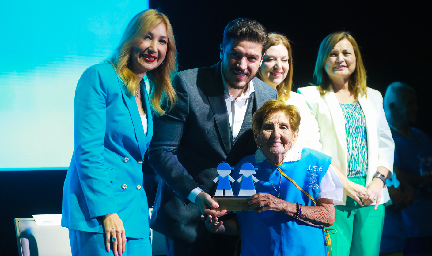 Teresa de Jesús Ramos, del municipio de Hualahuises, fue honrada por sus 50 años de servicio a la comunidad, desatando la algarabía de sus compañeras y compañeros.