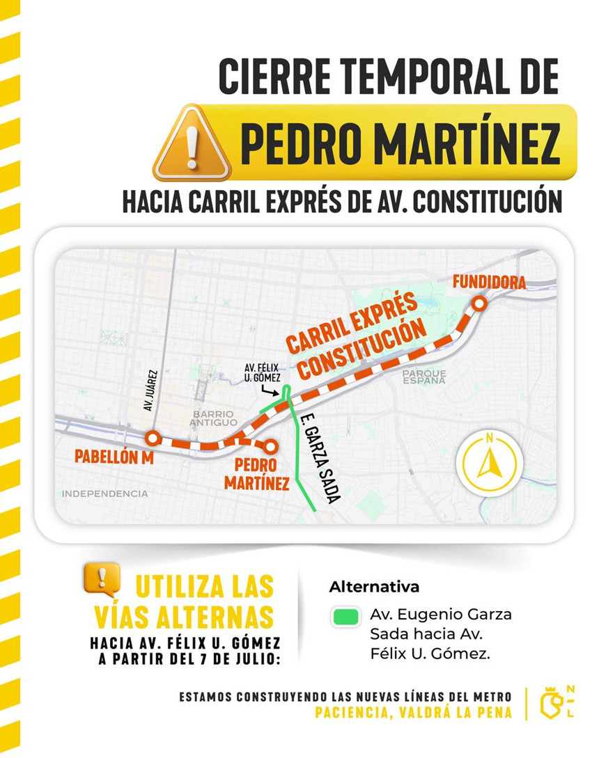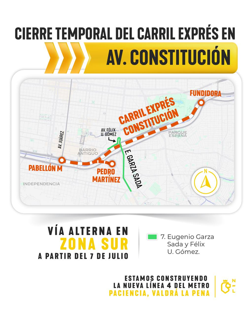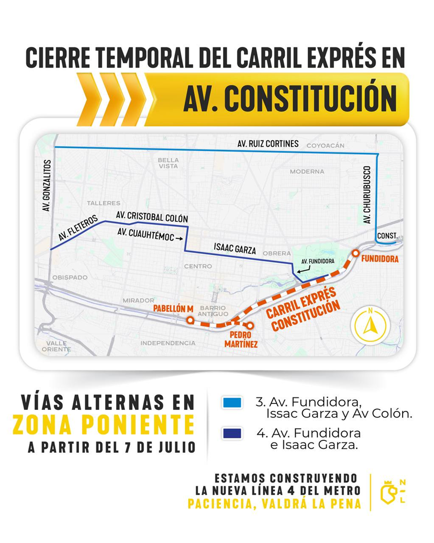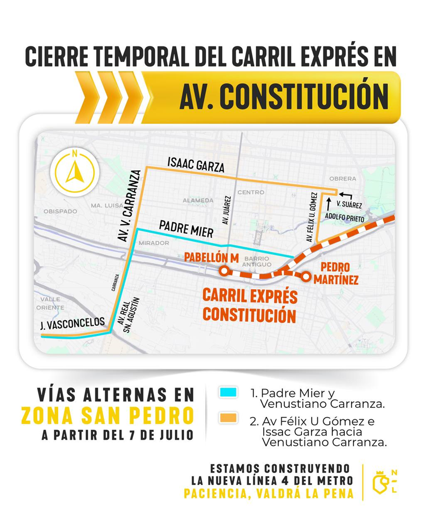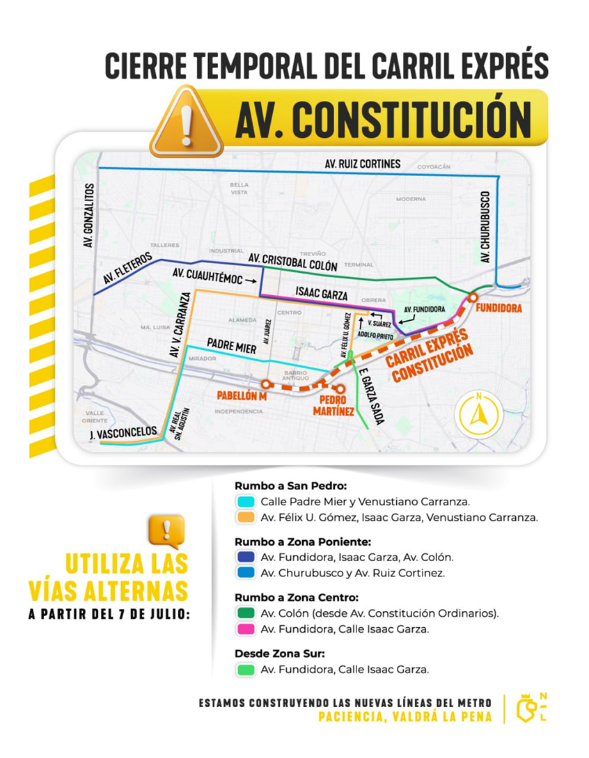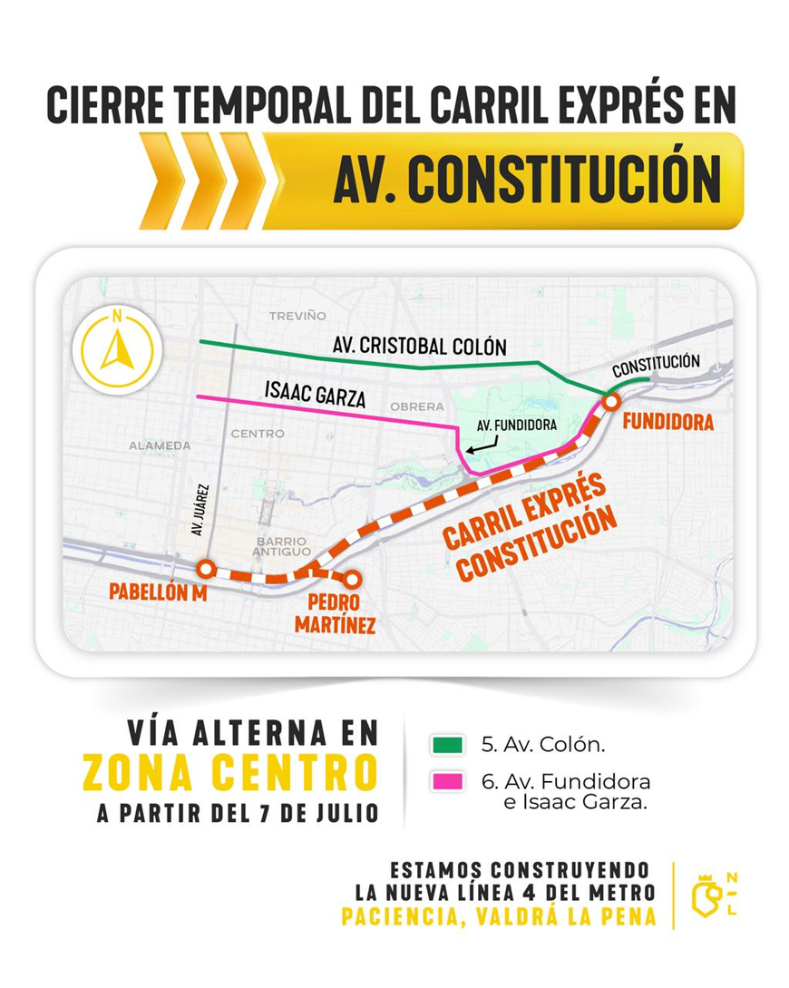 Monterrey, Nuevo León. – El Gobierno del Estado, a través de la Secretaría de Movilidad y Planeación Urbana y el Sistema de Transporte Colectivo Metrorrey, anunció el cierre temporal del carril exprés de la avenida Constitución desde su cruce con la avenida Cristóbal Colón, hasta la altura de la avenida Benito Juárez (Pabellón M), en el Centro de Monterrey.