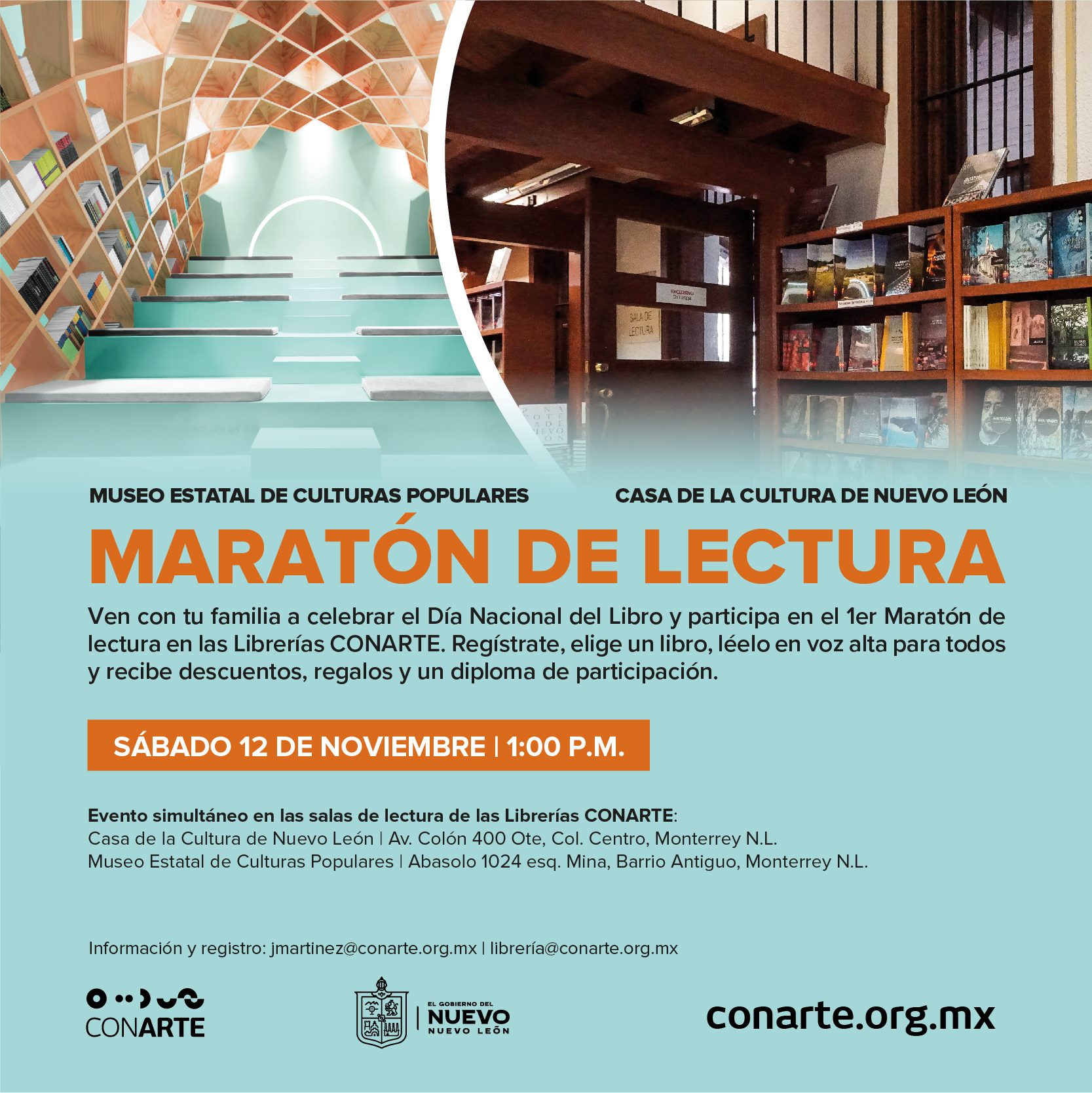 Ven con tu familia a celebrar el Día Nacional del Libro y participa en el 1° Maratón de lectura en las Librerías Conarte. Regístrate, elige un libro, léelo en voz alta para todos y recibe descuentos, regalos y un diploma de participación.