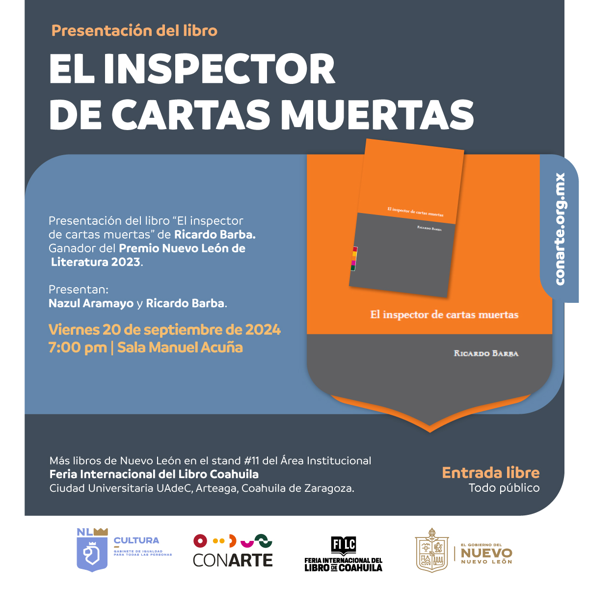 El libro “El Inspector de Cartas Muertas”, de Ricardo Barba, Premio Nuevo León de Literatura 2023, se presentará el viernes 20 de septiembre, a las 19:00 horas en esa misma sala, por Nazul Aramayo, escritor y reportero coahuilense. Ambas presentaciones son con entrada libre.