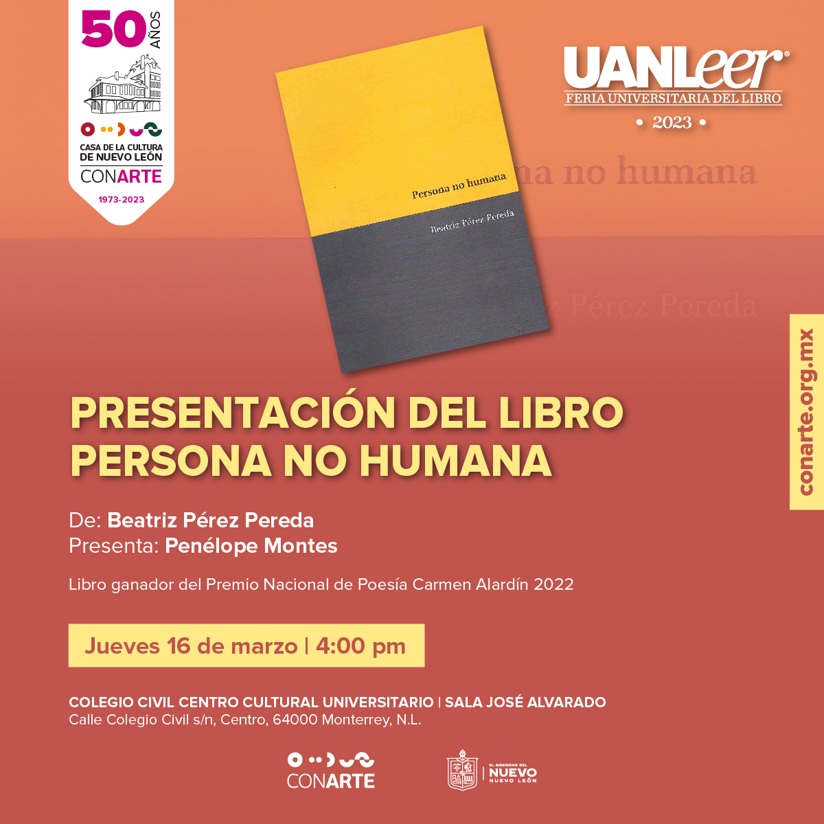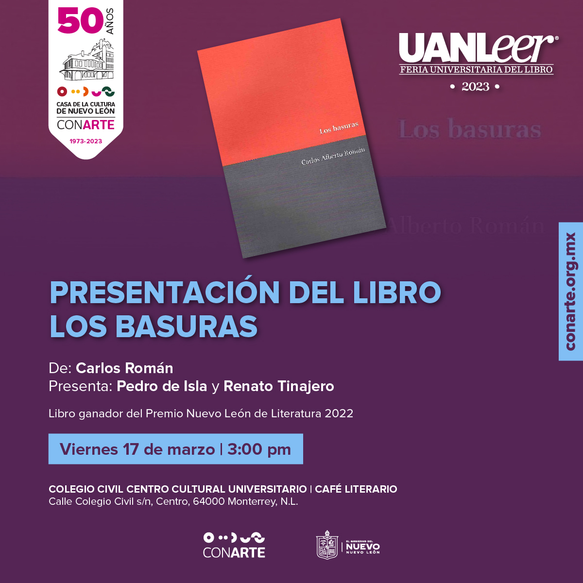 La presencia de CONARTE en esta edición de la UANLeer de este año se caracteriza por la presentación de dos libros galardonados: “Persona no humana” de Beatriz Pérez Pereda, ganadora del Premio de Poesía Carmen Alardín y “Los basuras” de Carlos Alberto Román, ganador del Premio Nuevo León de Literatura 2022. Además de los libros “La (des) ubicación de las cosas” de Jacobo Molina y “Cuentos de existencia” de Héctor Erasmo Garza.