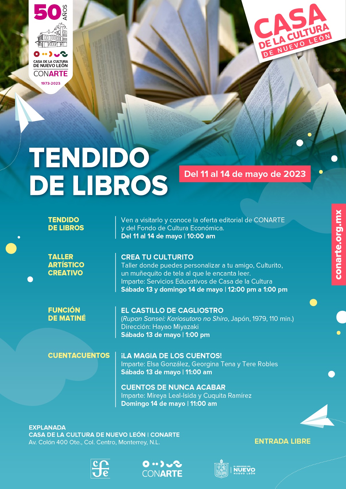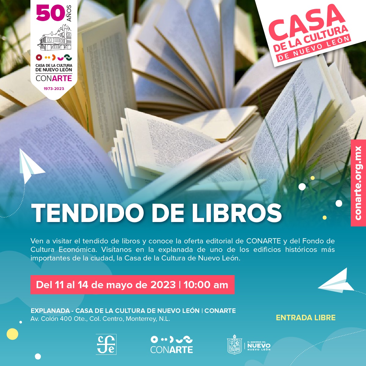 CONARTE y el Fondo de Cultura Económica (FCE) se unen por primera vez en el Tendido de Libros, un evento para que los públicos conozcan la oferta editorial que ofrecen ambas instituciones y puedan adquirir sus publicaciones a precios súper accesibles; la cita es a partir del jueves 11 al domingo 14 de mayo, a partir de las 10 AM, en la Explanada de la Casa de la Cultura de Nuevo León | CONARTE.