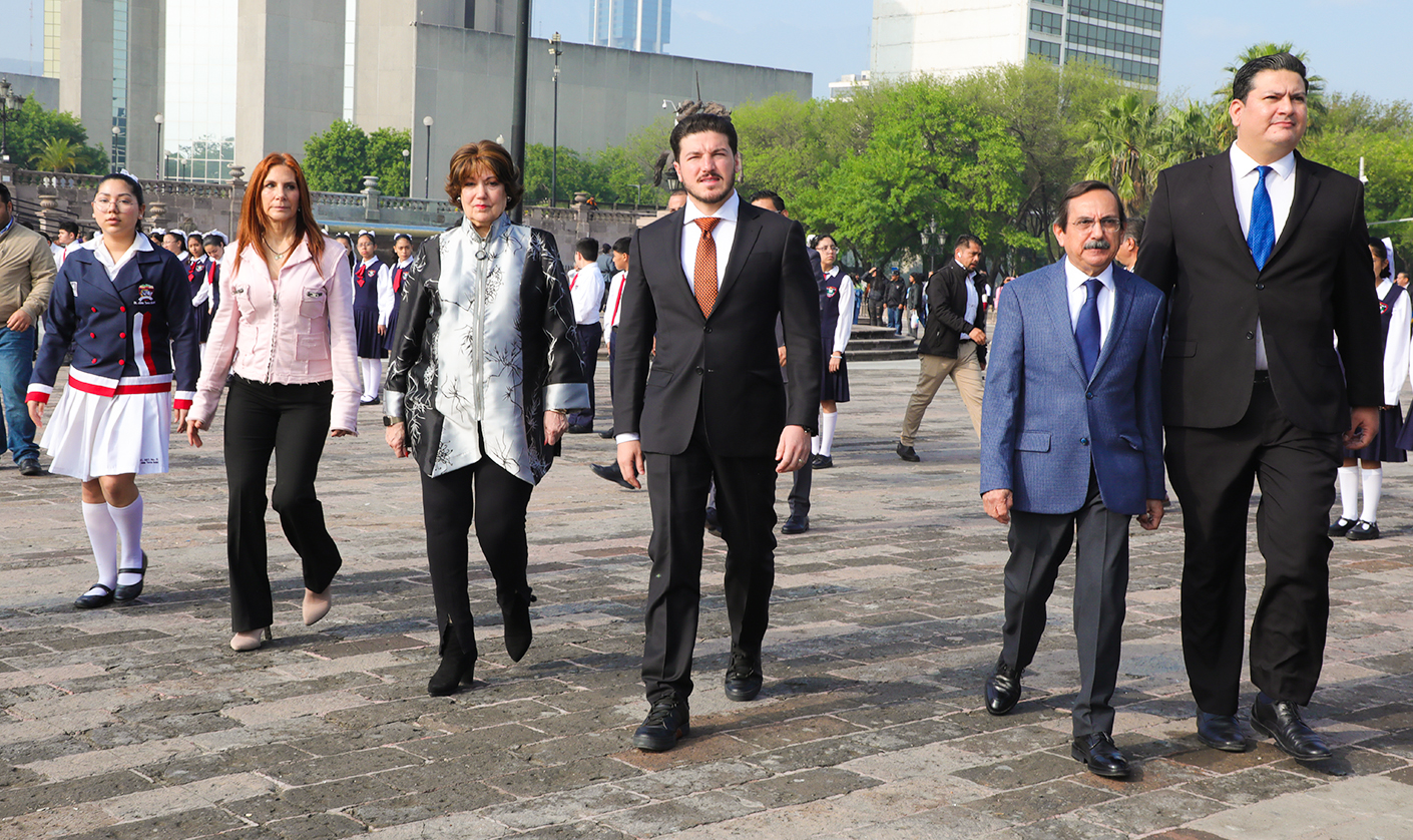 En la Explanada de los Héroes el Mandatario neolonés izó la Bandera Monumental y montó una Guardia de Honor ante el Monumento del Benemérito de las Américas acompañado de funcionarios estatales, federales, municipales y mandos militares.