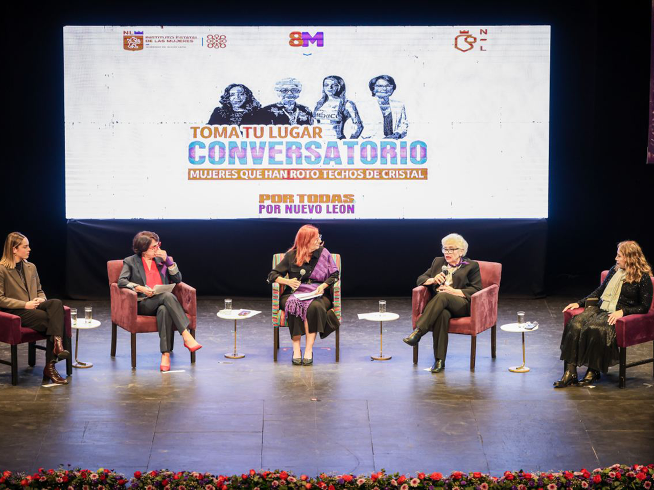 El conversatorio fue realizado en la Gran Sala del Teatro de la Ciudad de Monterrey y contó con la presencia de Graciela Buchanan, Secretaría de las Mujeres; Maricarmen Martínez Villareal, Secretaría de Turismo; Sofíaleticia Morales, Secretaría de Educación; Betsabé Rocha Nieto, Secretaría Técnica de Gobierno; Gloría Bazan, Directora General del Sistema DIF, integrantes de las instancias municipales de mujeres y titulares de las unidades de igualdad.