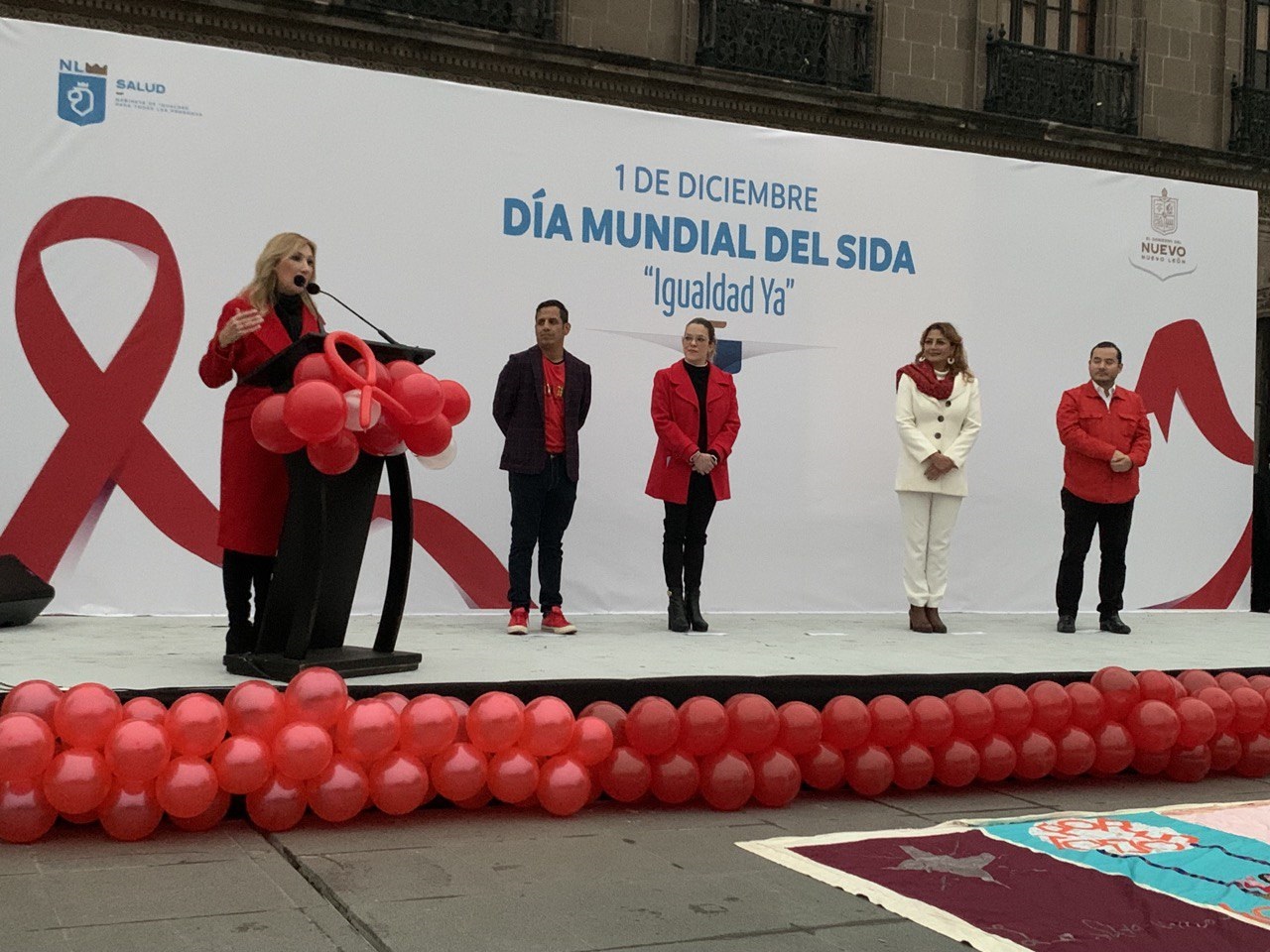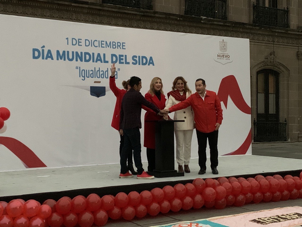 El Palacio de Gobierno de Nuevo León se iluminó en color rojo con motivo de la conmemoración del Día Mundial del Sida, que este año tiene como lema “Igualdad Ya”.
