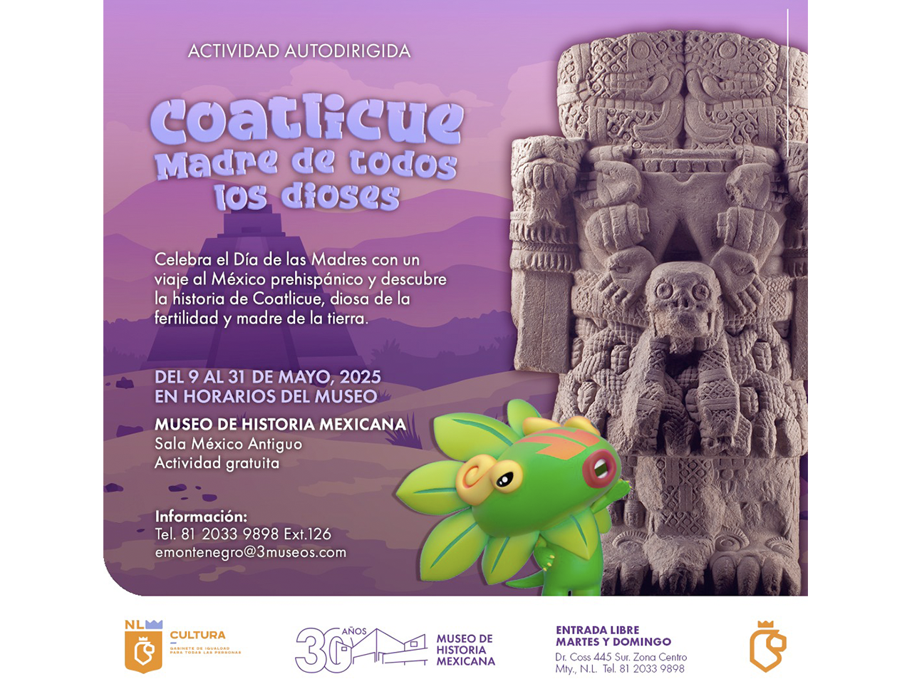 Monterrey, Nuevo León.- Porque ser madre es crear mundos, dar luz y formar estrellas, durante el mes de mayo el Museo de Historia Mexicana te invita a descubrir el poder de la maternidad ancestral con la actividad autodirigida “Coatlicue, madre de todos los dioses”, del 9 al 31 de mayo.