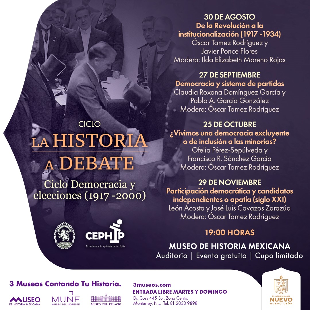 Monterrey, Nuevo León.- La Historia a Debate. Democracia y elecciones (1917 -2000), analizará desde el surgimiento del Sistema Político Mexicano postrevolucionario hasta la forma en que la democracia y la ciudadanía mexicana han evolucionado a lo largo de un siglo XX, a través de un debate mensual que iniciará el miércoles 30 de agosto.