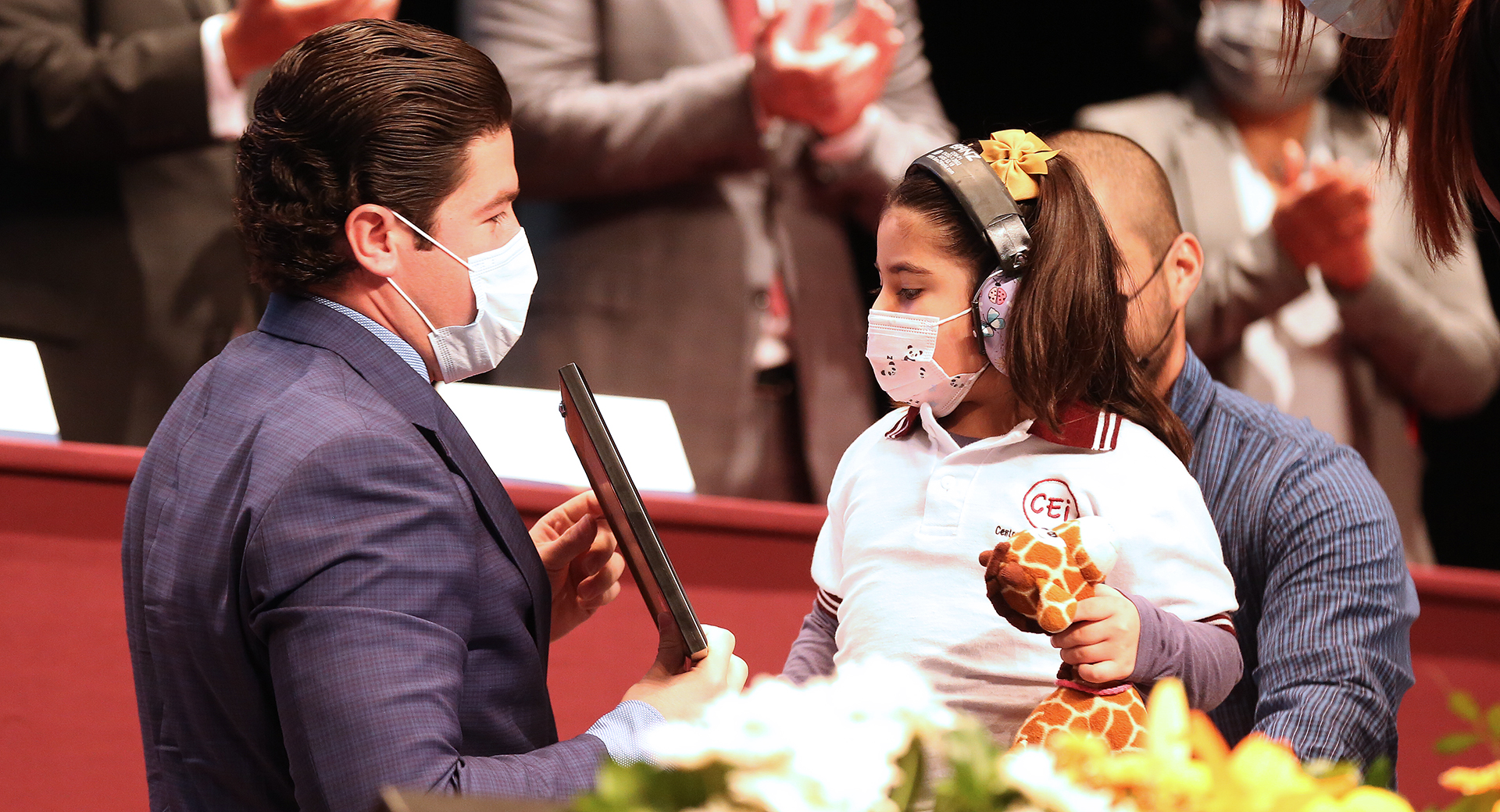 En el evento el Gobernador entregó reconocimientos por sus habilidades educativas a las niñas Isabela Salinas González y Fátima María Martínez Hernández, quienes asisten al Centro de Educación Integral del SUSPE.