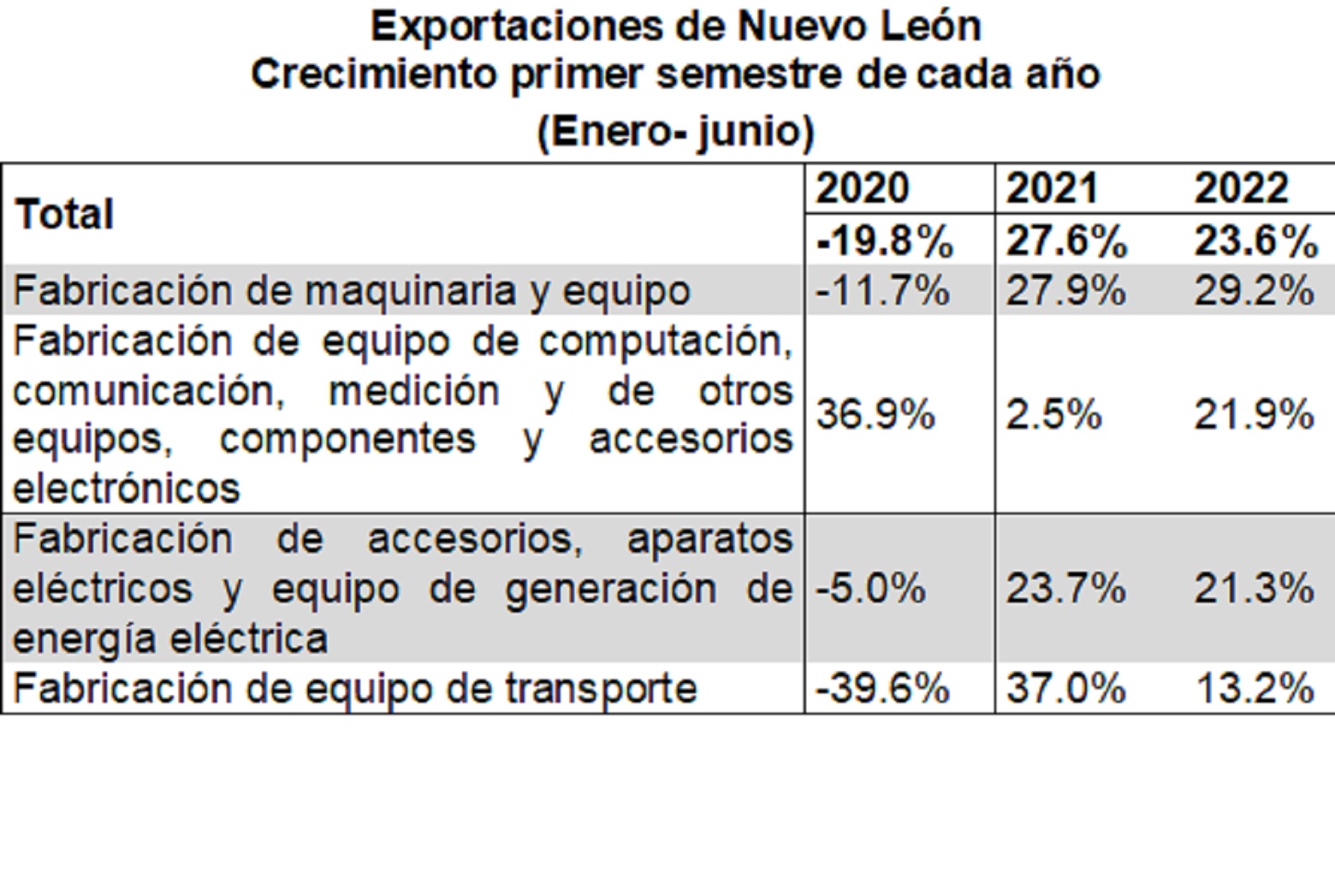 Las exportaciones de Nuevo León se incrementaron 23.6% durante el primer semestre del año, en comparación con el mismo periodo de 2021.