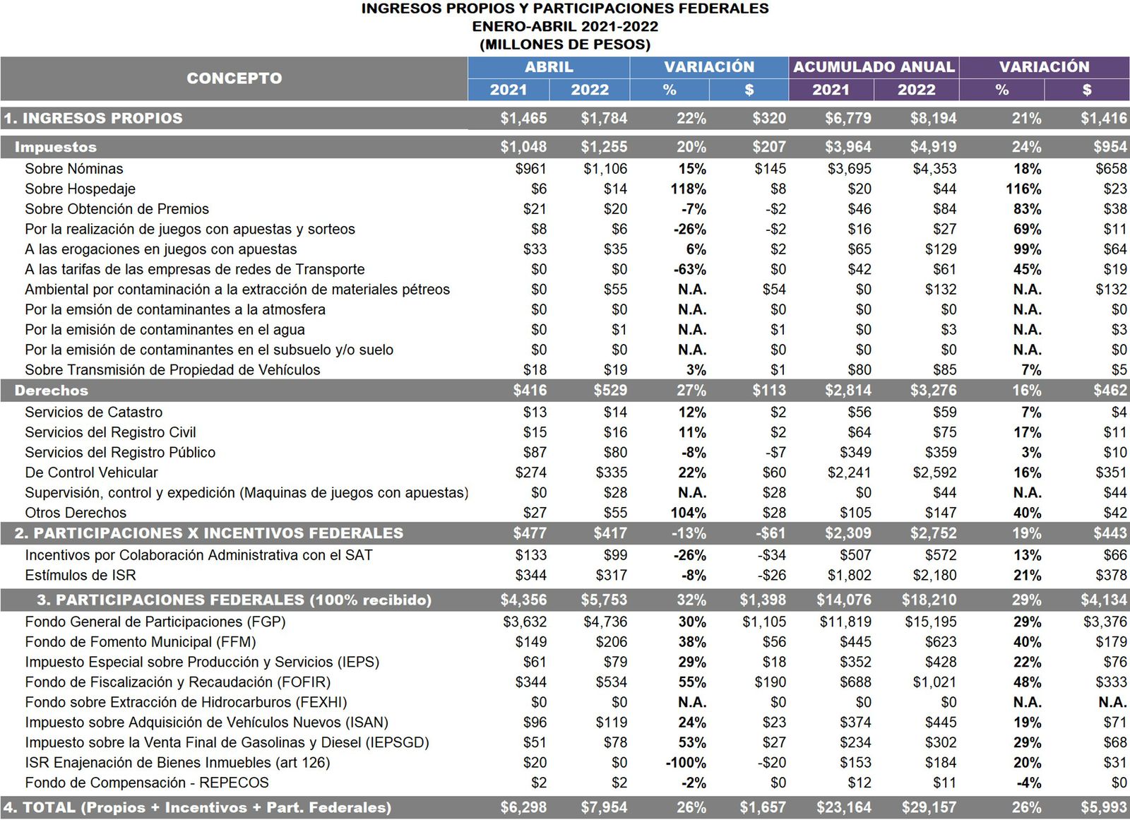 Las participaciones que envía el Gobierno Federal fueron 5 mil 753 millones de pesos, 32 por ciento más que las recibidas en abril de 2021, y 48 por ciento superior a lo establecido en el presupuesto.