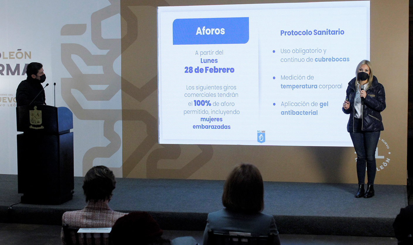 Al continuar el Semáforo Epidemiológico en Nuevo León en amarillo, al reportarse 6 indicadores en color verde, 2 en amarillo y 2 en rojo y 1 pero con una baja considerable en contagios y hospitalizaciones por Covid-19, el aforo en comercios y establecimientos con espacios abiertos y cerrados se incrementa a un 100 por ciento a partir de este lunes 28 de febrero.