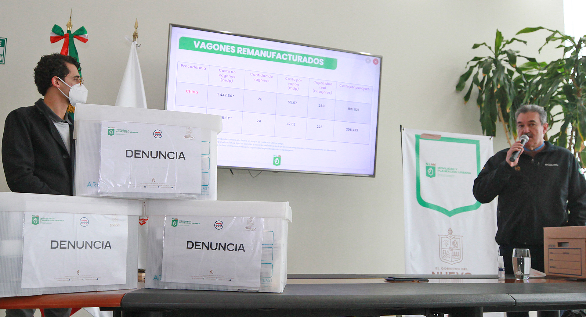 El Secretario de Movilidad y Planeación Urbana, Hernán Villarreal, dio a conocer que presentará denuncia ante la Fiscalía Anticorrupción por presuntas irregularidades detectadas en el proceso de adjudicación directa en la adquisición y contratación del servicio de reacondicionamiento de los vagones alemanes para STC Metrorrey.