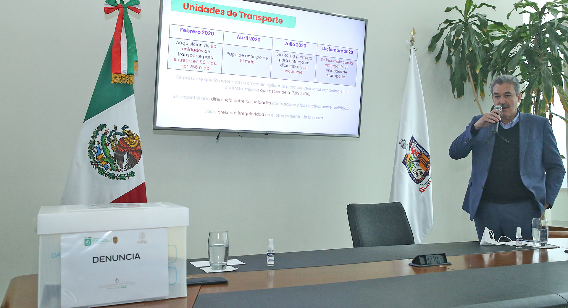 “Se pagó un anticipo de 51 millones de pesos y se otorgó una prórroga para entrega en diciembre, pero se incumple con la entrega de 25 unidades de transporte”, dijo Villarreal.