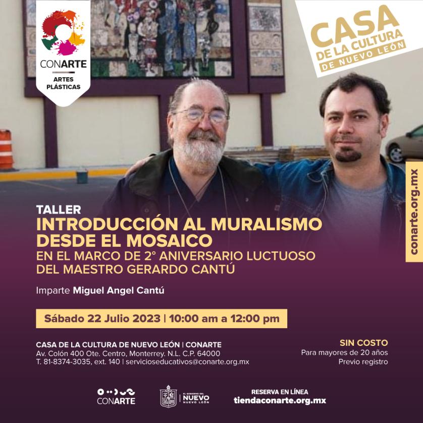 Monterrey, Nuevo León.- Los materiales y herramientas que el maestro Gerardo Cantú utilizó para la realización de sus murales con técnica del mosaico en la Universidad Autónoma de Nuevo León y el Paseo Santa Lucía, serán comentados por su hijo, el artista visual Miguel Ángel Cantú, en el Taller de Introducción al muralismo desde el mosaico en el marco de segundo aniversario luctuoso del maestro Gerardo Cantú, que se ofrecerá el sábado 22 Julio 2023 a las 10:00 AM en la Casa de la Cultura de Nuevo León | CONARTE.