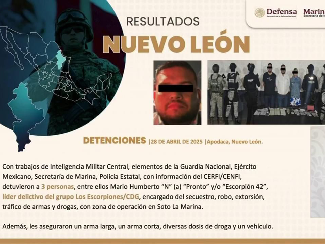Asimismo, el funcionario federal informó sobre la detención de Mario “N” en el municipio de Apodaca; considerado como objetivo prioritario pues se presume que forma parte de un grupo delictivo que tiene presencia nacional, en cuál se desempeñaba como líder de plaza. Además, se presume que coordinaba actividades ilícitas secuestro, robo, extorsiones, tráfico de armas y drogas; con zona de operación en Soto la Marina.