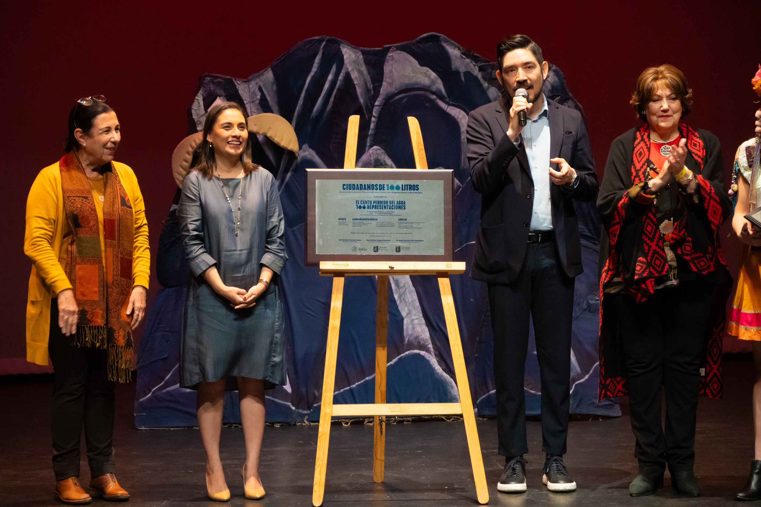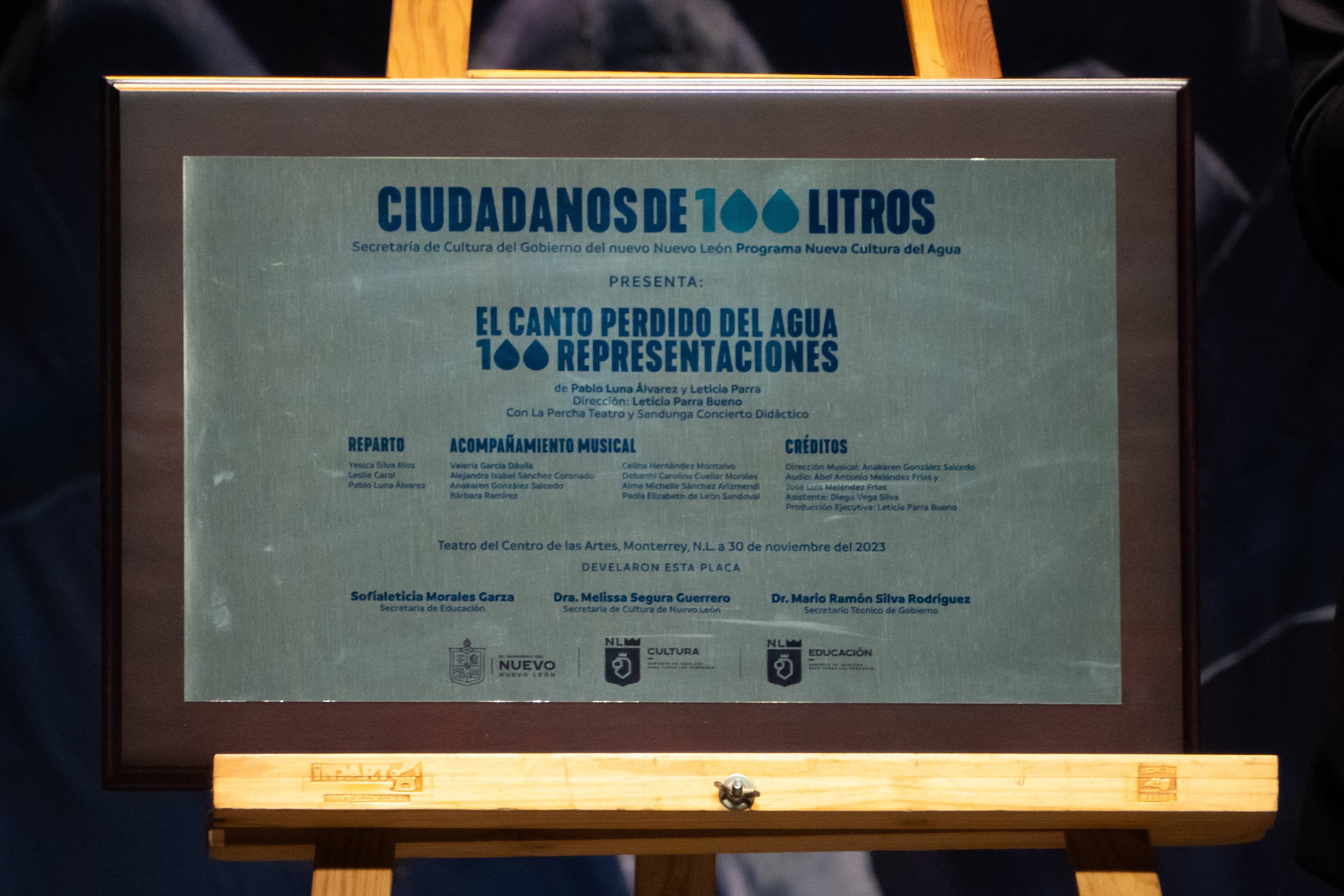 Tras cumplir 100 representaciones ante públicos infantiles de Nuevo León, la Secretaría de Cultura develó la placa que consigna ese logro del proyecto de Nueva Cultura del Agua, encabezado por la dependencia en coordinación con otras áreas de gobierno.