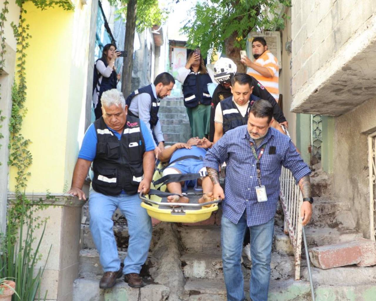 Para el traslado se requirió el apoyo de elementos de Protección Civil Estatal, facilitando una camilla y así poderlo bajar por las escalinatas que dificultaban el acceso al domicilio del señor José.