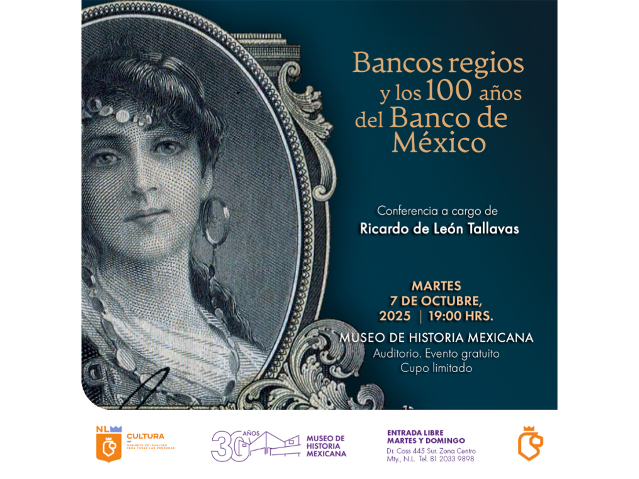 Monterrey, Nuevo León.- El Museo de Historia Mexicana invita a la conferencia “Bancos regios y los 100 años del Banco de México”, que ofrecerá el especialista en numismática Ricardo de León Tallavas, el martes 7 de octubre a las 19:00 horas en el auditorio del museo.