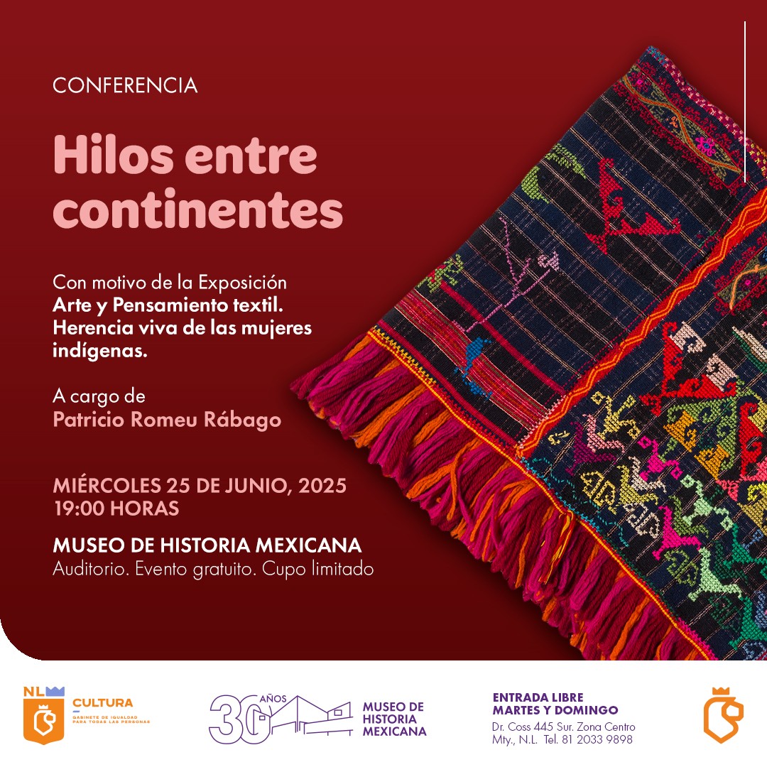 La conferencia “Hilos entre continentes. Tradiciones e intercambios en el arte textil de los pueblos de México” con Patricio Romeu Rábago se llevará a cabo el miércoles 25 de junio a las 19:00 horas en el Museo de Historia mexicana, la entrada es gratuita y el cupo limitado. Para más información www.3museos.com