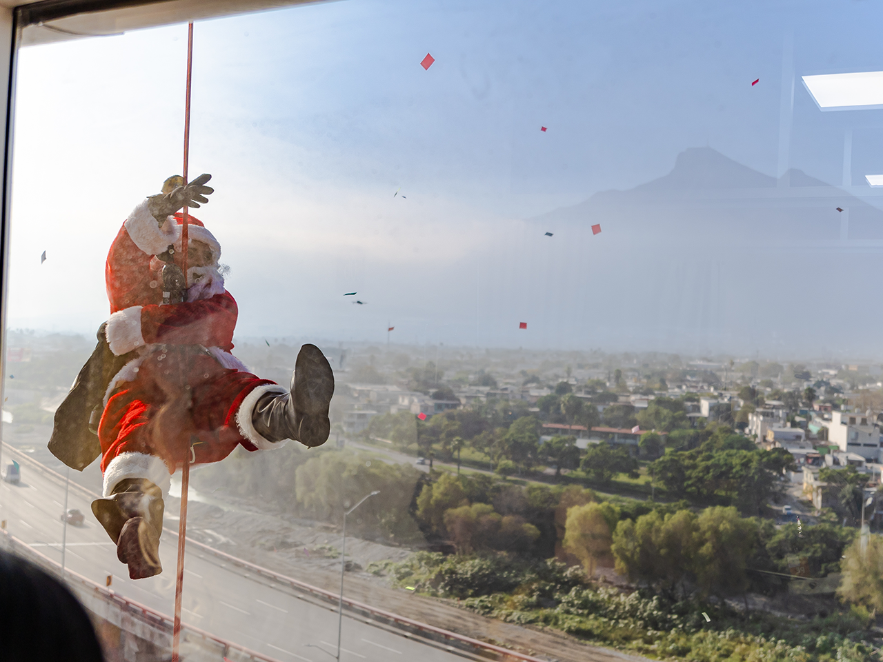- Personajes vestidos de Santa Claus y superhéroes descendieron por la fachada del Hospital.