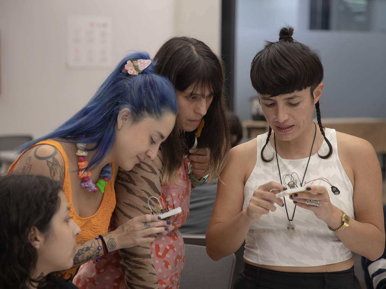 A partir de artefactos sonoros, como sintetizadores, hechos con baja tecnología y reciclaje electrónico, su presentación exploró el ruido como fenómeno rítmico, político y sensible, poniendo en juego prácticas DIY y enfoques tecnofeministas.