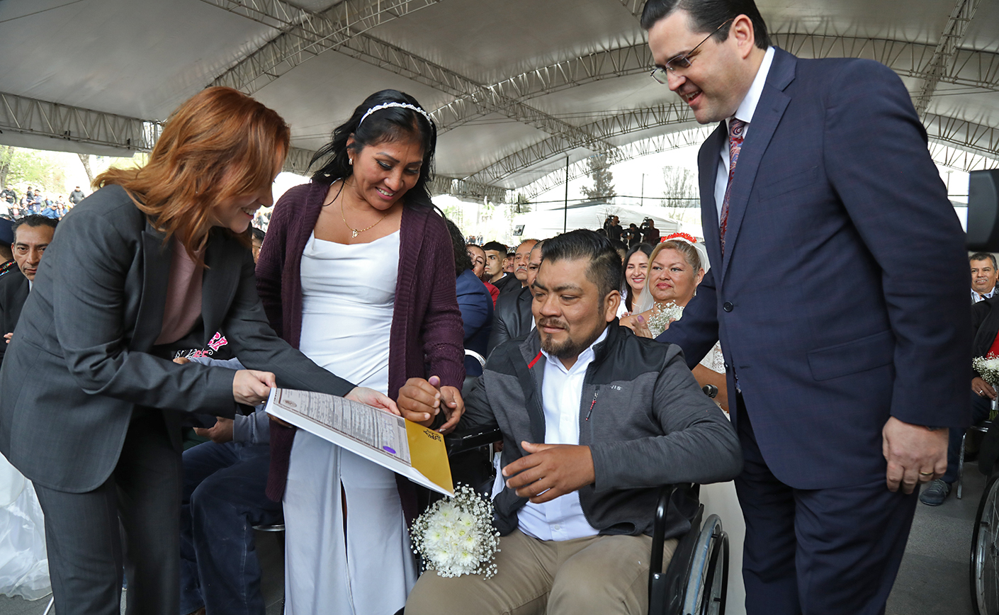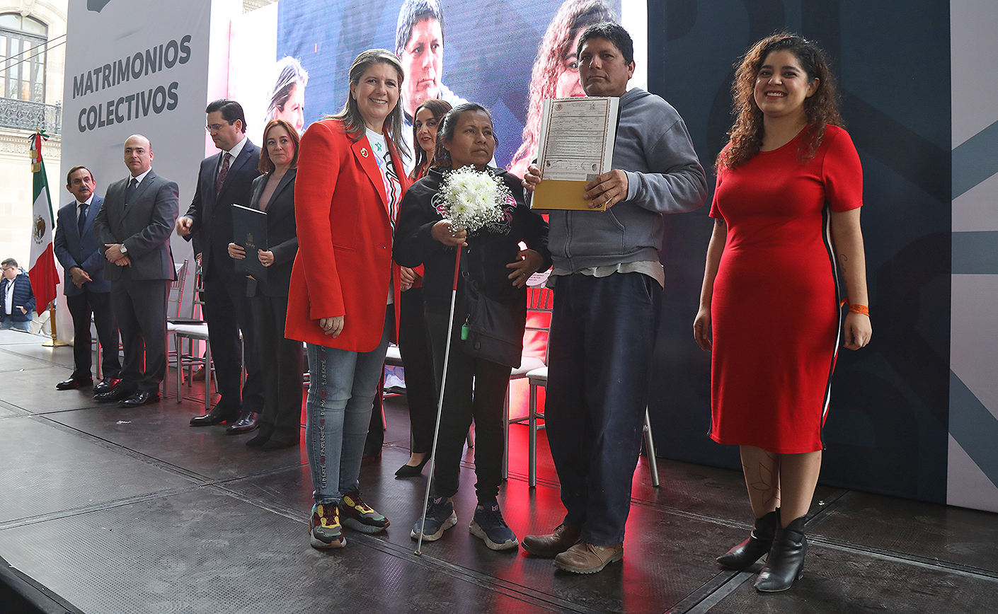 Al final de la ceremonia tanto el director del Registro Civil como César Javier Gómez, representante del Secretario General de Gobierno, Javier Navarro, y las secretarias de Igualdad e Inclusión, Martha Herrera; de Turismo, Maricarmen Martínez; de las Mujeres, Graciela Buchanan, entregaron las respectivas Actas de Matrimonio a las parejas contrayentes.