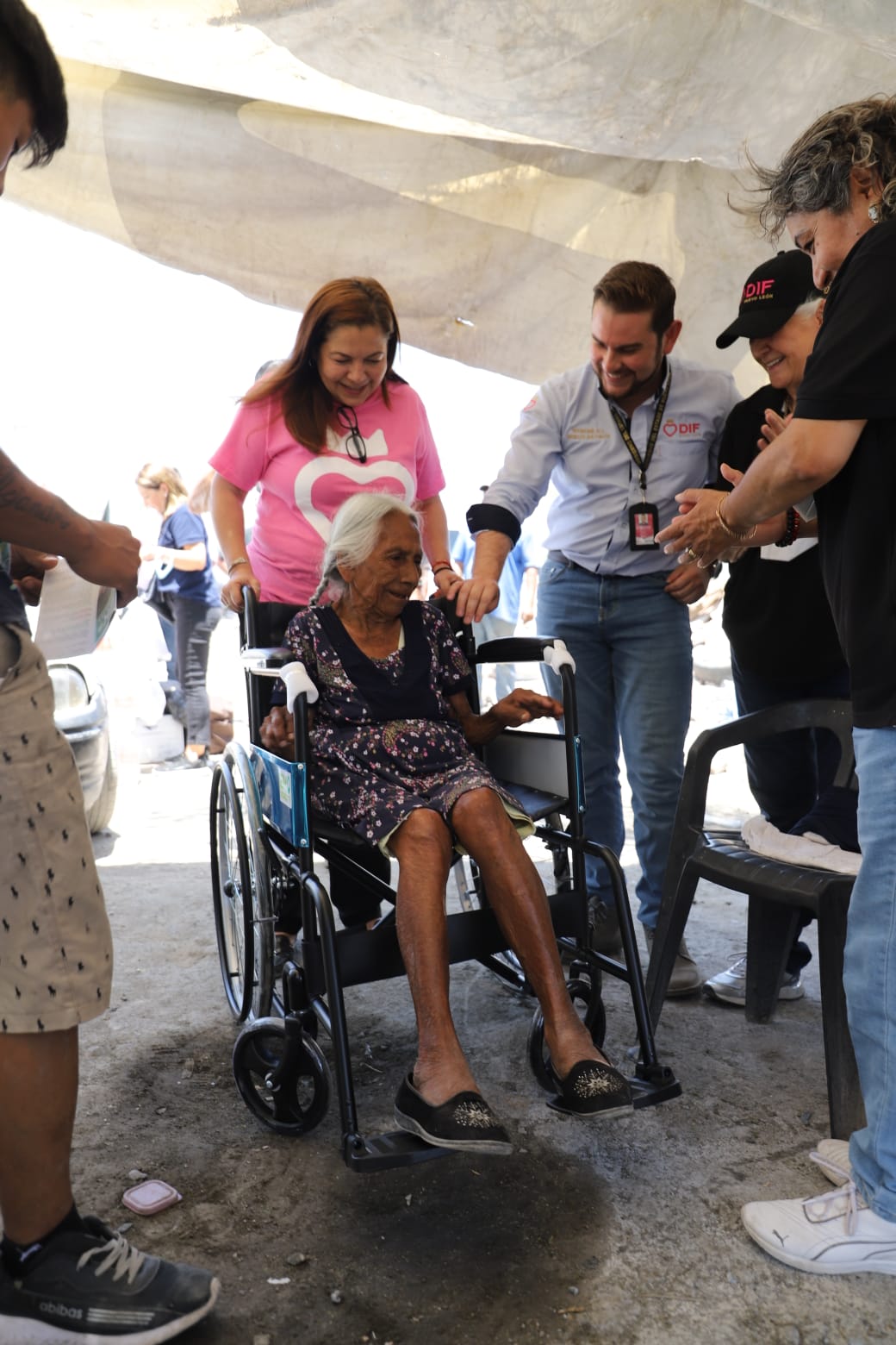 Gloria Bazán Villarreal, encargada del despacho del DIF NL, encabezó la entrega de una silla de ruedas, alimentos donados por el restaurante El Papalote, así como ropa para niñas, niños y adultos.