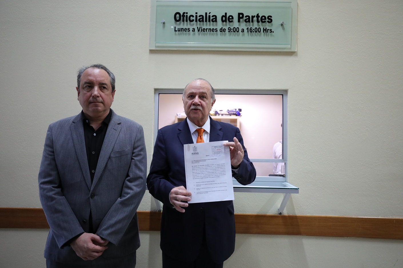 Acompañado del Secretario de Finanzas y Tesorero General del Estado, Carlos Garza, el documento fue entregado en la Oficialía de Partes del Congreso del Estado por el Dr, Javier Luis Navarro Velasco, Encargado de Despacho del Poder Ejecutivo del estado, por Resolución Judicial y Ministerio de Ley, en ejercicio de la facultad que le confieren los artículos 87, 88, 96 fracciones VII, IX y X, 111, 119, 121 y 127 de la Constitución Política del Estado Libre y Soberano de Nuevo León; 2, 8, 18 Apartado A fracciones I, III y IV, 22, 24 y 25 de la Ley Orgánica de la Administración Pública para el Estado de Nuevo León; 25, 26 y demás relativos de la Ley de Administración Financiera para el Estado de Nuevo León.