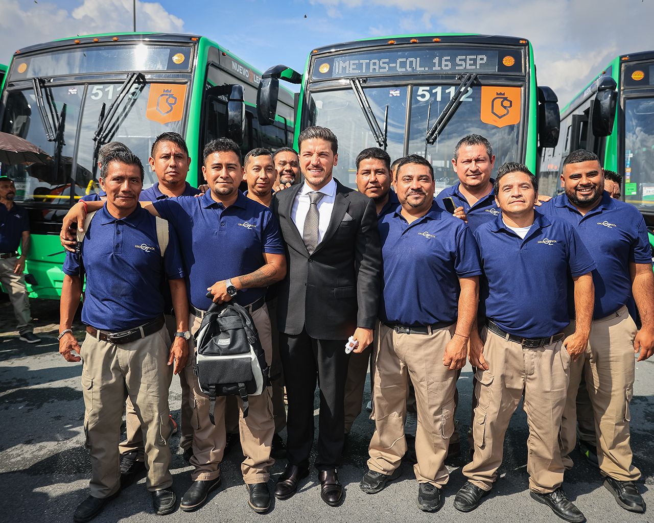 "Tenemos 4 mil nuevos camiones, orgullosamente Volvo, Hecho en Nuevo León, con clima, internet, seguridad, botón de pánico y además Fuerza Civil de manera estratégica yendo a la ruta donde puede haber denuncias o delitos.