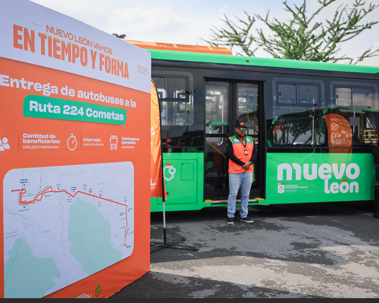 Monterrey, Nuevo León.- Avanzando con la reestructura del sistema de transporte público en la cuenca Monterrey-Guadalupe-Juárez, el Gobernador de Nuevo León, Samuel Alejandro García Sepúlveda llevó a cabo la entrega de 16 nuevas unidades para la ruta 224 Cometas.
