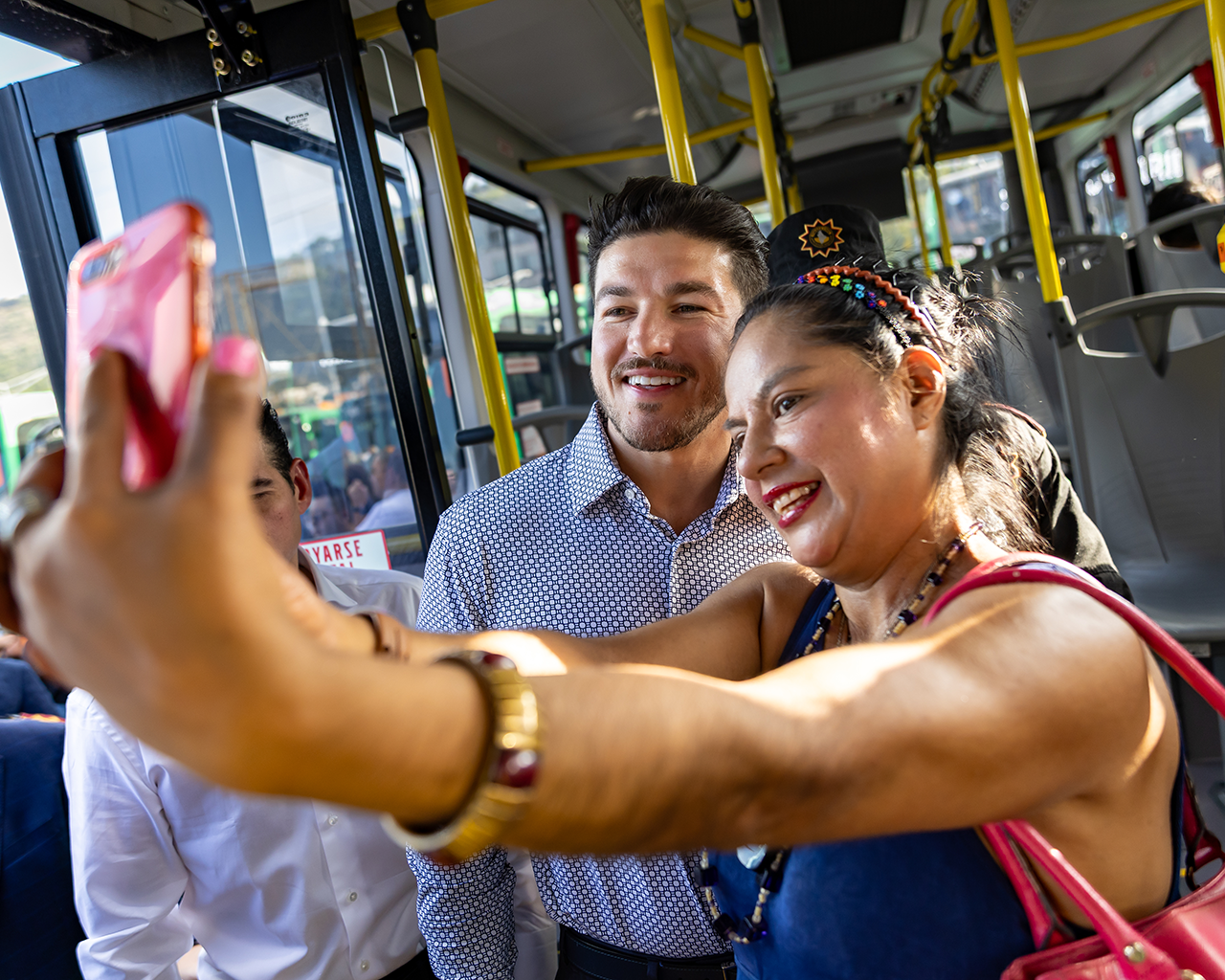 San Pedro Garza García, Nuevo León.- Porque el Gobierno del Estado trabaja para brindar a las y los neoloneses la movilidad que siempre debieron tener, el Gobernador Samuel Alejandro García Sepúlveda entregó este jueves 40 nuevos camiones sustentables para la Ruta 203 de la Cuenca Monterrey - San Pedro - Santa Catarina - García, los cuales son fabricados en Nuevo León por las empresas Marcopolo y Volvo.