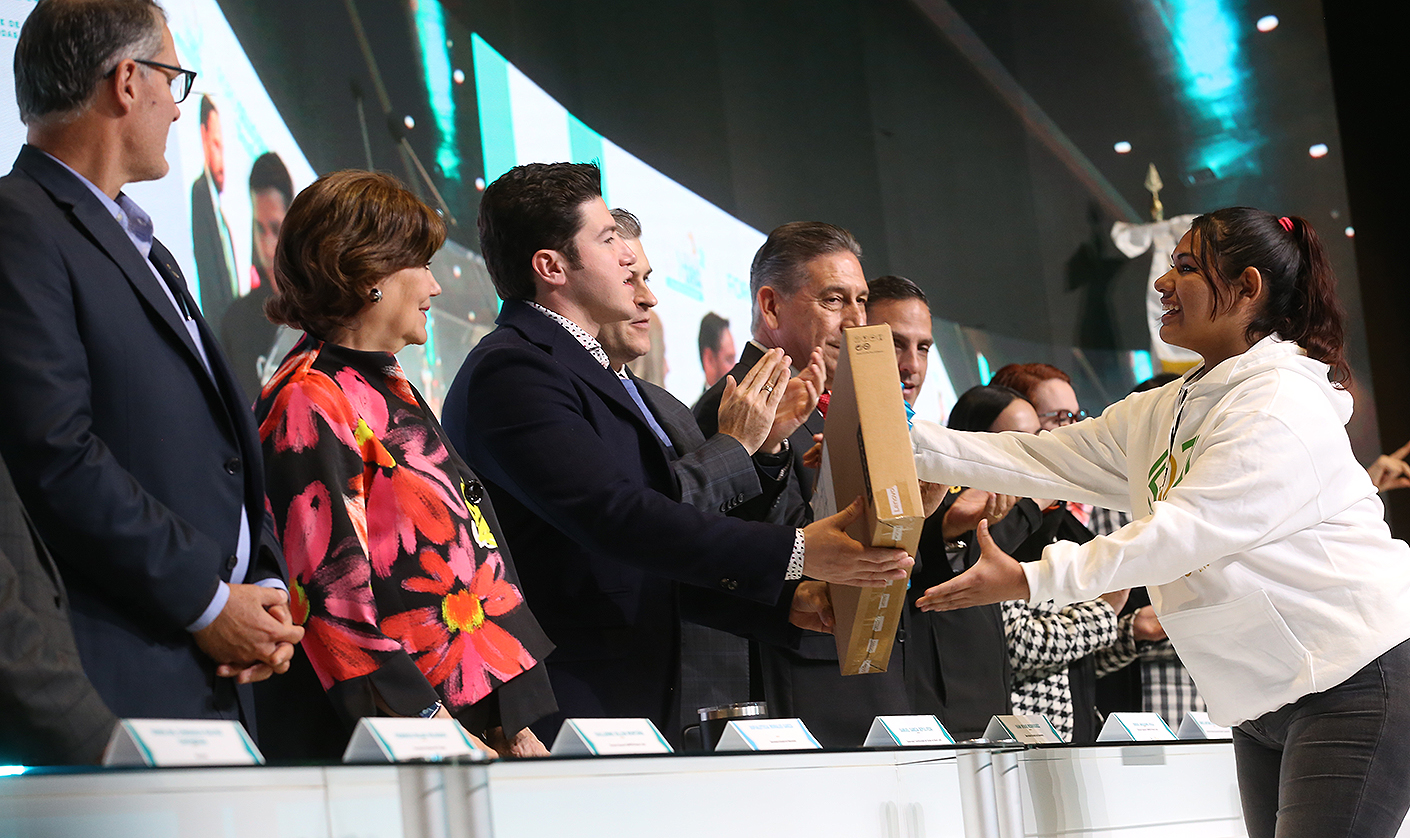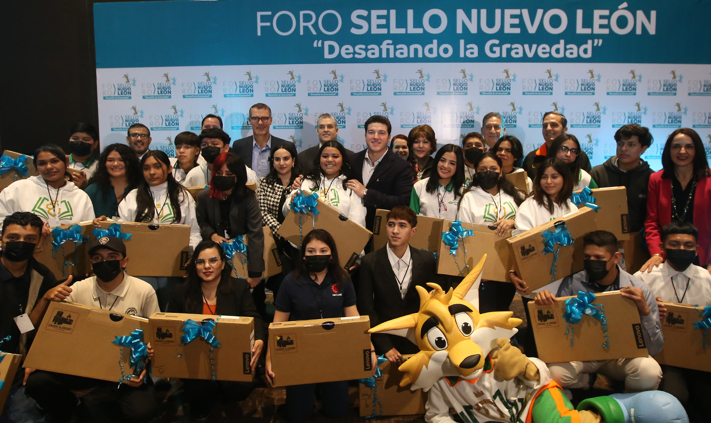 El Gobernador de Nuevo León, Samuel Alejandro García Sepúlveda encabezó la entrega de más de mil computadoras a jóvenes que forman parte del Programa de Educación Dual, tras inaugurar el Foro "Sello Nuevo León: Desafiando la Gravedad", un ciclo de conferencias en el que participaron estudiantes, docentes y directivos de instituciones públicas de educación media superior y superior, así como representantes de la iniciativa privada.
