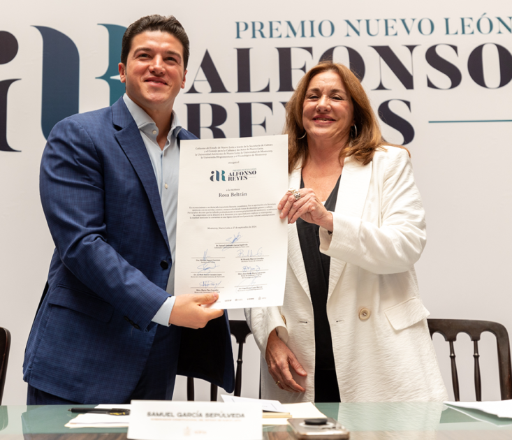 Monterrey, Nuevo León.- Por sus méritos en el campo de las letras y humanidades, el Gobernador de Nuevo León, Samuel Alejandro García Sepúlveda entregó el Premio Nuevo León Alfonso Reyes a la escritora, Rosa Beltrán.